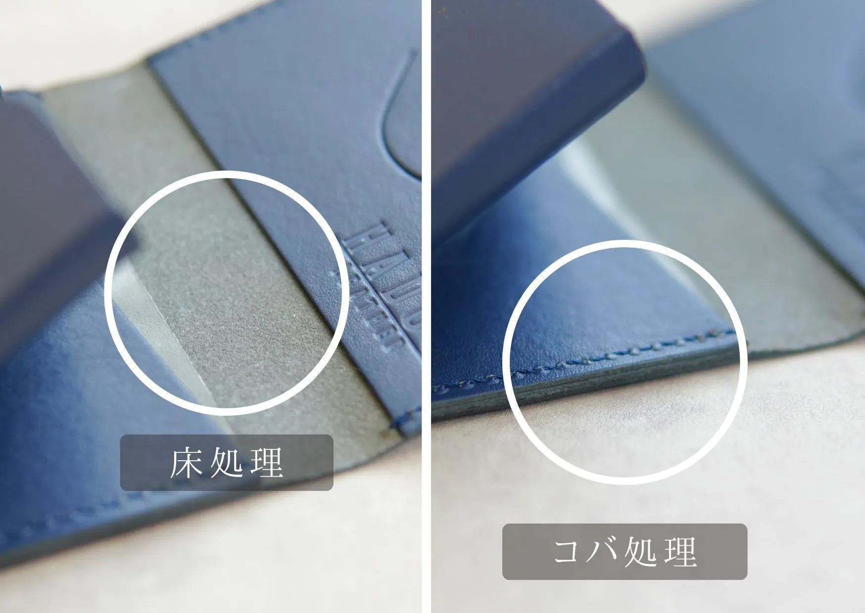 革の床(裏面)やコバ(革の断面)は素材そのままでは毛羽立って見た目が悪いことや、革自体の耐久性も悪くなります。床やコバを整える工程は手間と時間を要するところですが、細かいところまで品質向上に努め、長く使えるよう心がけております。