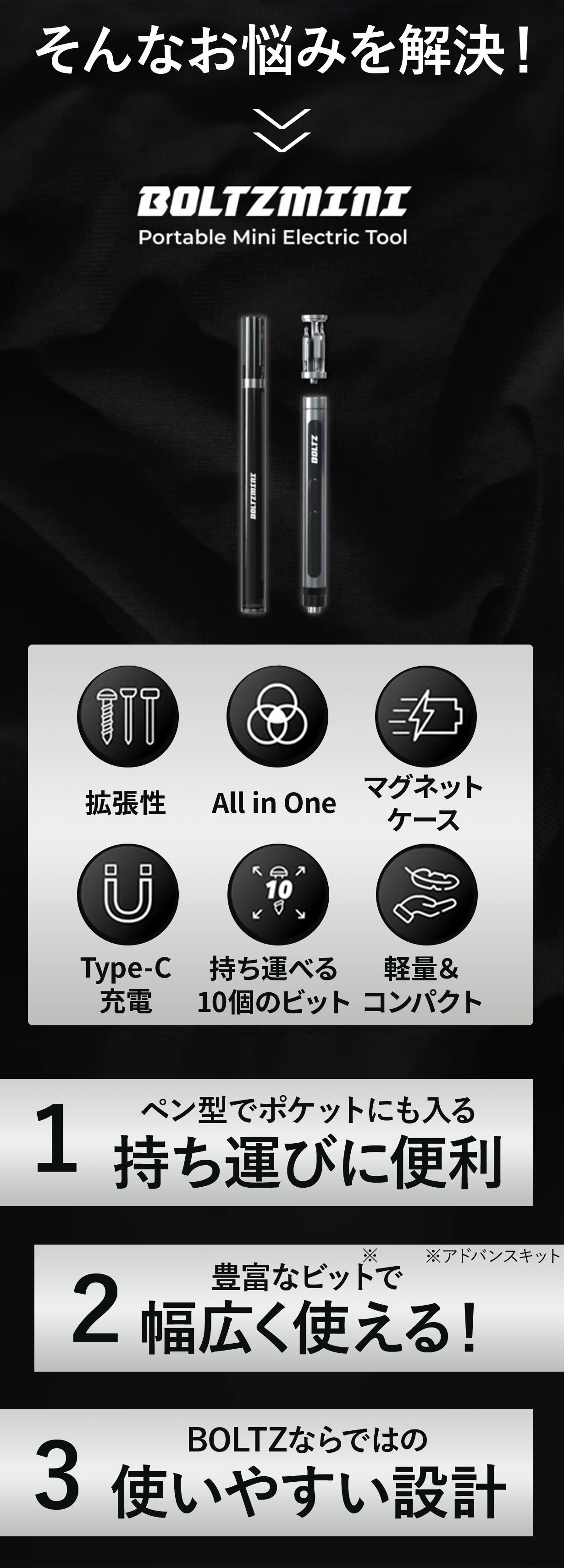 BOLTZ MINIは高トルクパワーのおかげで、ツールビットを交換するだけでボルトの締め付けや緩め、穴あけが可能です。