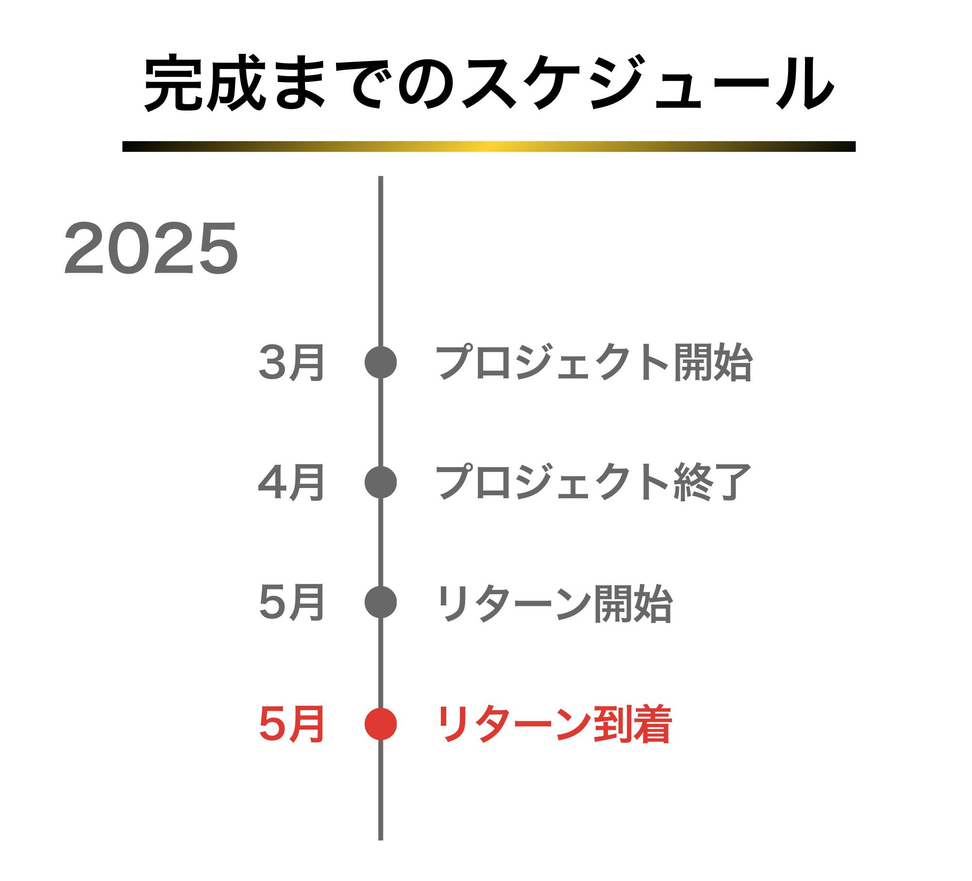 ※本文中に記載させていただいたスケジュールは、あくまでプロジェクト公開時点の予定です。クラウドファンディングを経て輸入を行う性質上、配送遅延のおそれがございます。