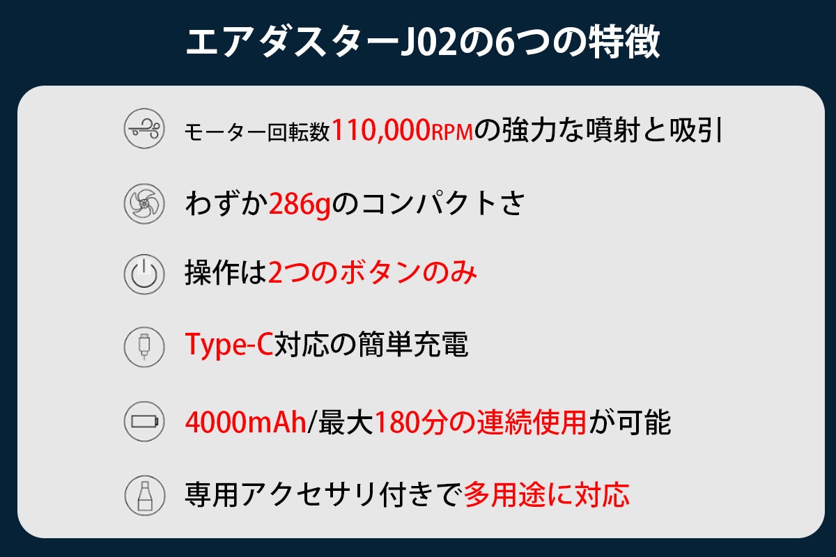 Air Duster J02は、吸引とエア噴射の2way機能を備え、車内のホコリや汚れはもちろん、アウトドアや家庭内でも幅広く活用可能です。わずか286gの軽量設計で持ち運びも簡単。薬剤やフィルター交換の必要がなく、環境にも配慮した設計となっています。