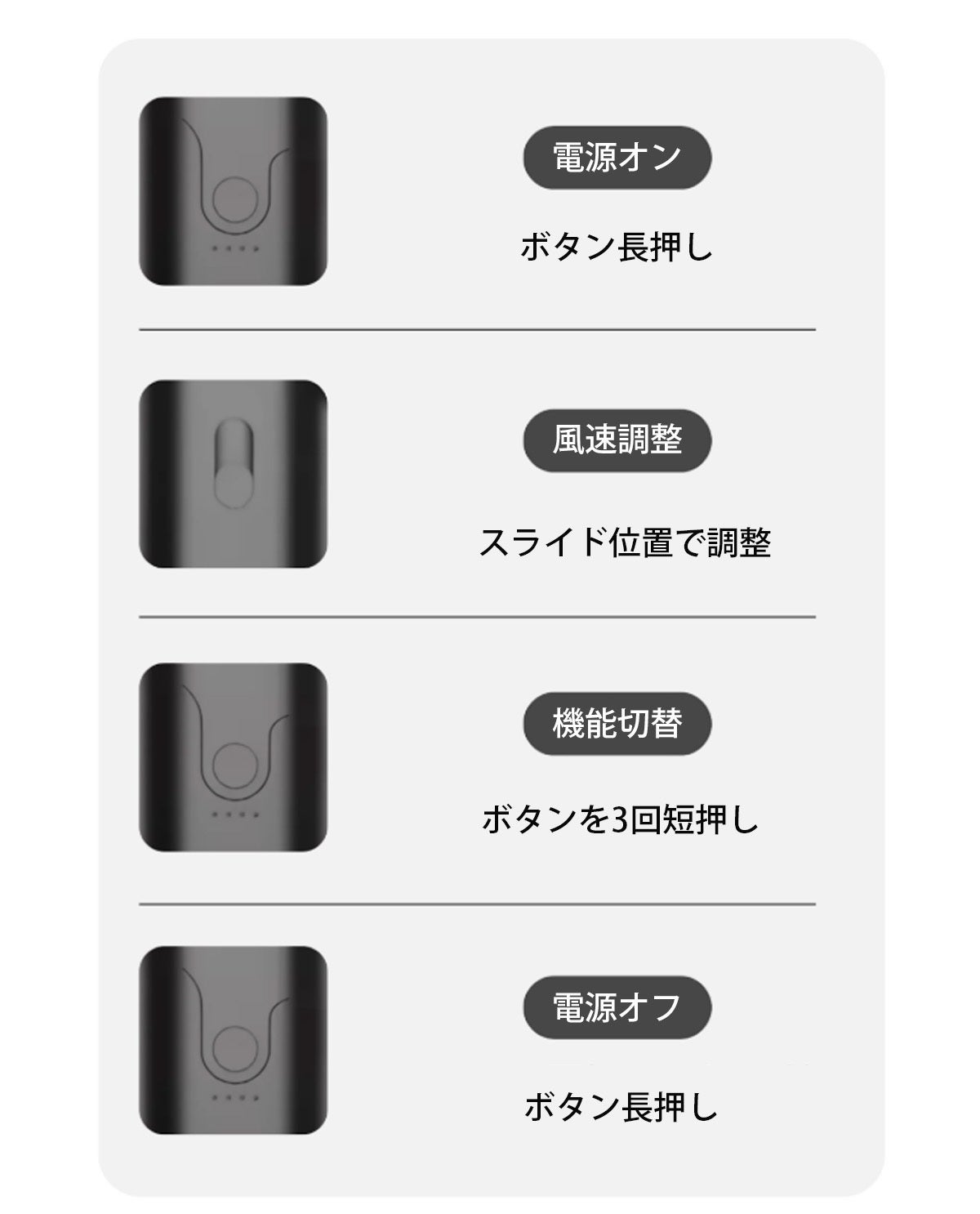 ボタンは長押しで電源のオン・オフ、3回短押しで送風機能と掃除機機能を切り替えることができます。
