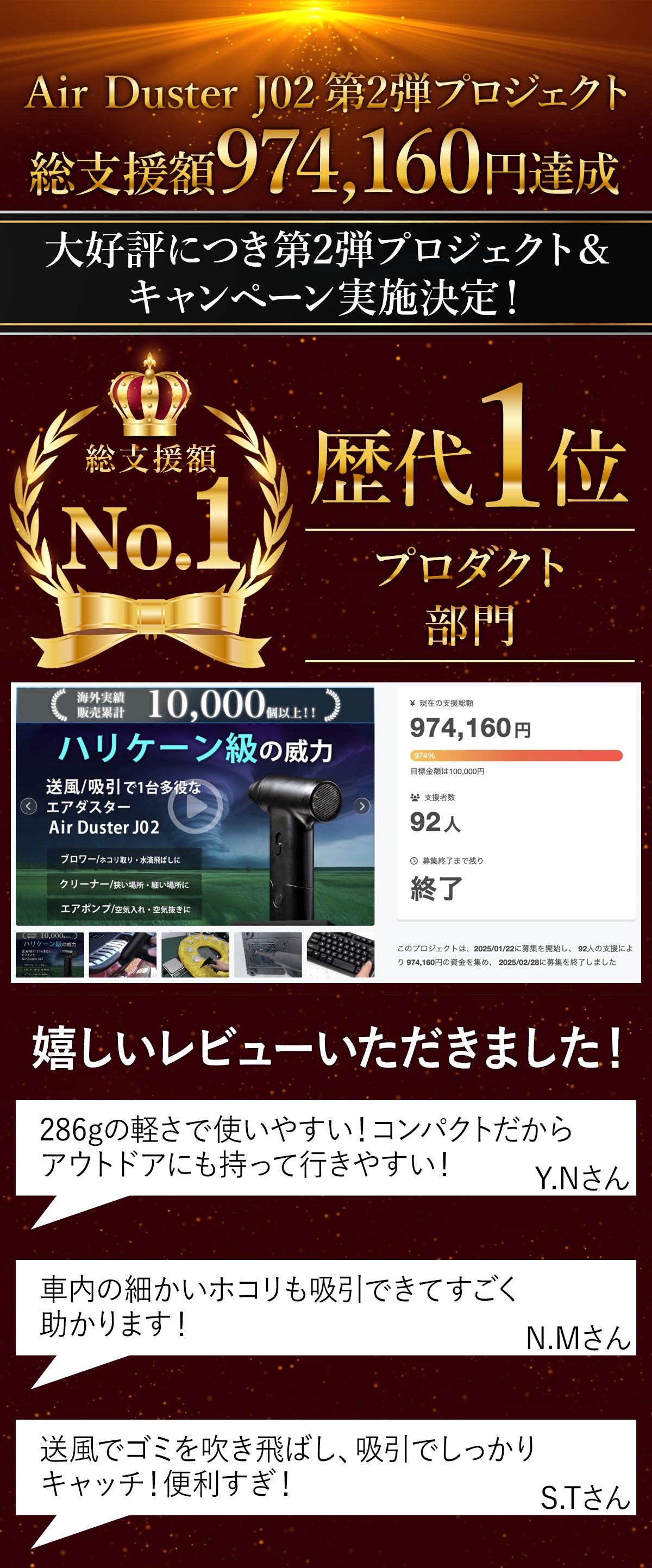 今回提案する商品は、吸引&エア噴射の2way機能を備え、車内のホコリや汚れを効率的に掃除できるだけでなく、家庭やアウトドアでも幅広く活躍する「Air Duster J02」です。軽量設計で持ち運びにも便利なため、多くの方にこの利便性を知っていただきたいと思い、プロジェクトの立案に至りました。