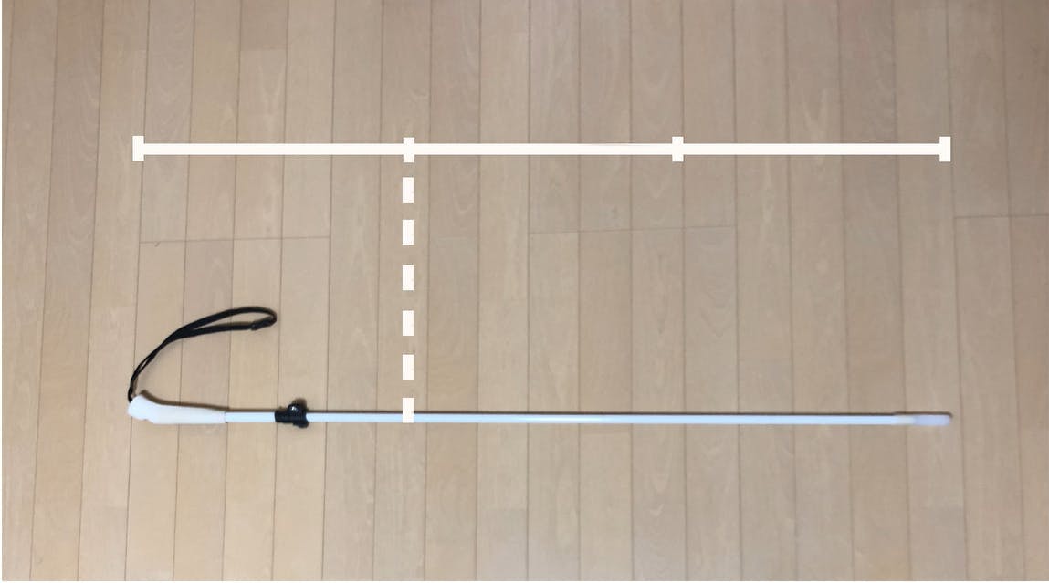 白杖の上からおよそ3分の1の位置が、重心にあたります。このあたりにベルトを取り付けると、白杖が安定し、扱いやすくなります。ただし、この位置はあくまで目安です。白杖の長さや身長によって使いやすさには違いがありますので、実際に使ってみて、持ちやすい場所にベルトの位置を調整してください。
