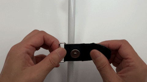 ベルト先端を、マグネットホック横にある長方形の金具の穴に通して、先端部分を引っ張って折り返し、面ファスナーでしっかりと留めます。裏側は特殊な滑り止め加工になっており、ずれにくくなっています。