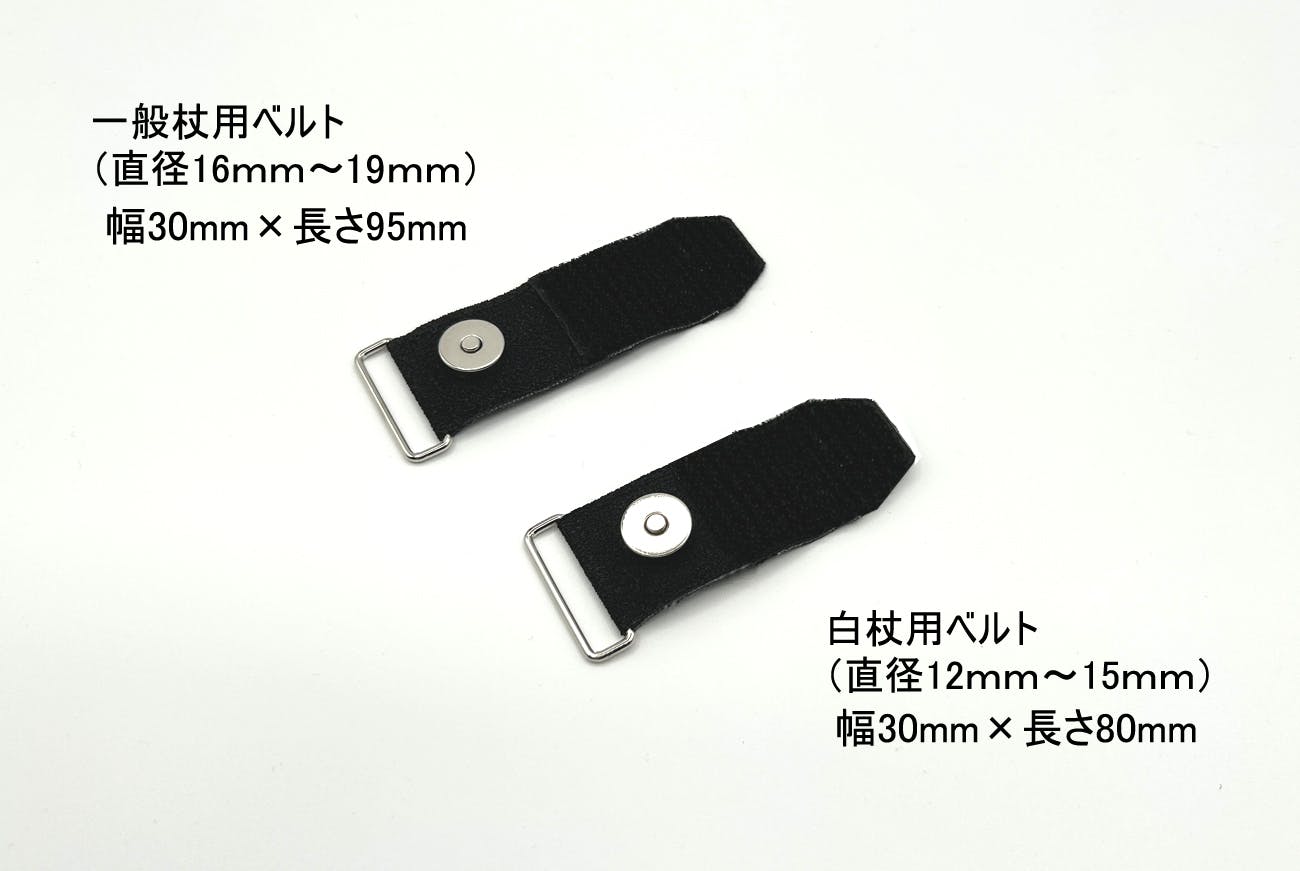 白杖用ベルトは、シャフトの直径が約12mm~15mmのものに対応しています。シンボルケーンを除くほとんどの白杖に取り付け可能です。
