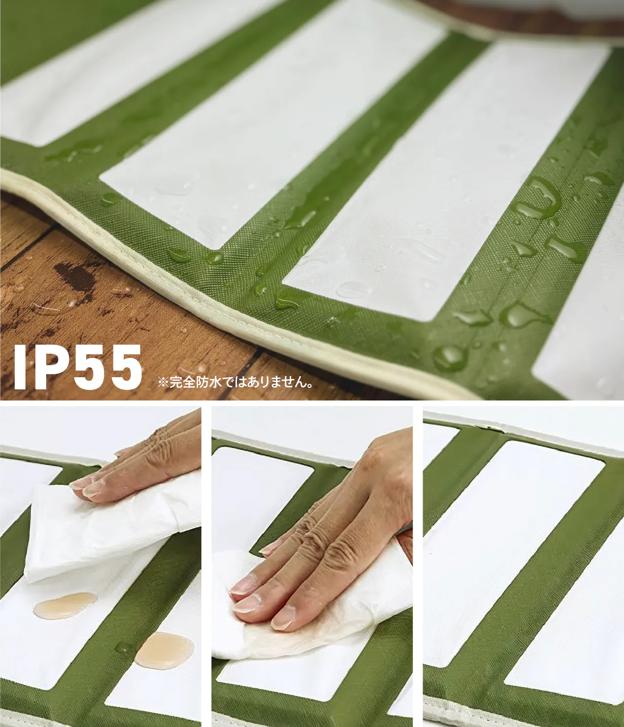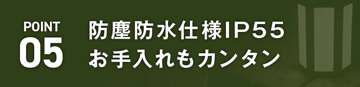 ソーラーパネルとライト部分はIP55防塵防水仕様(モバイルバッテリーの端子を除く)。