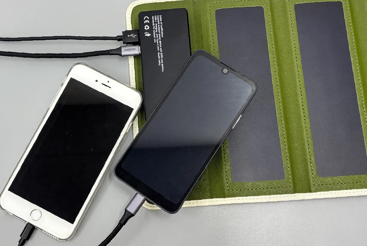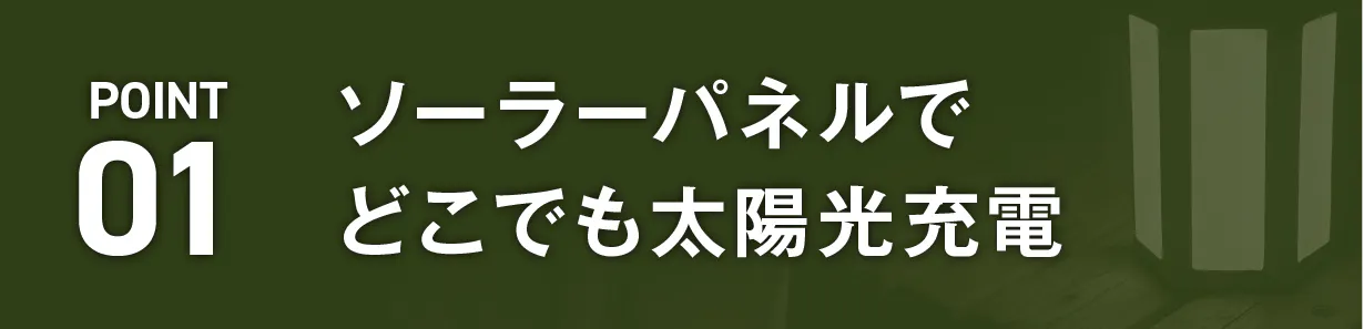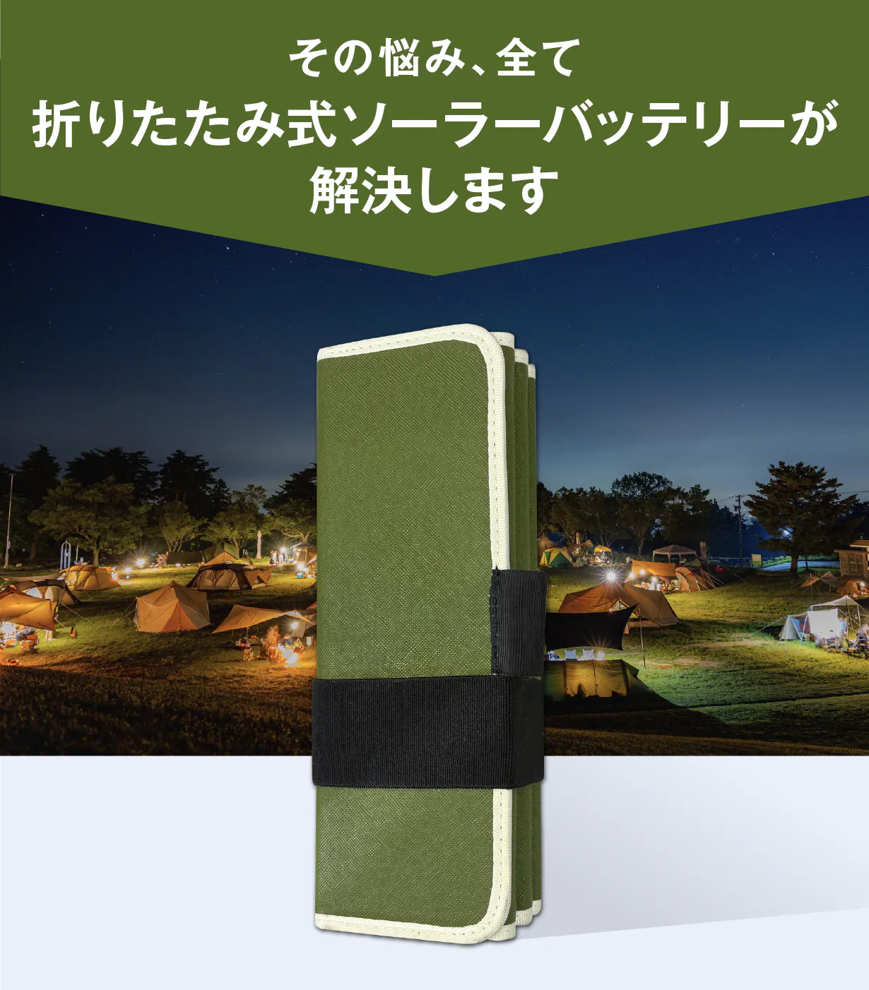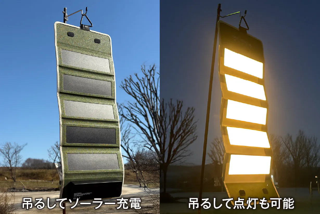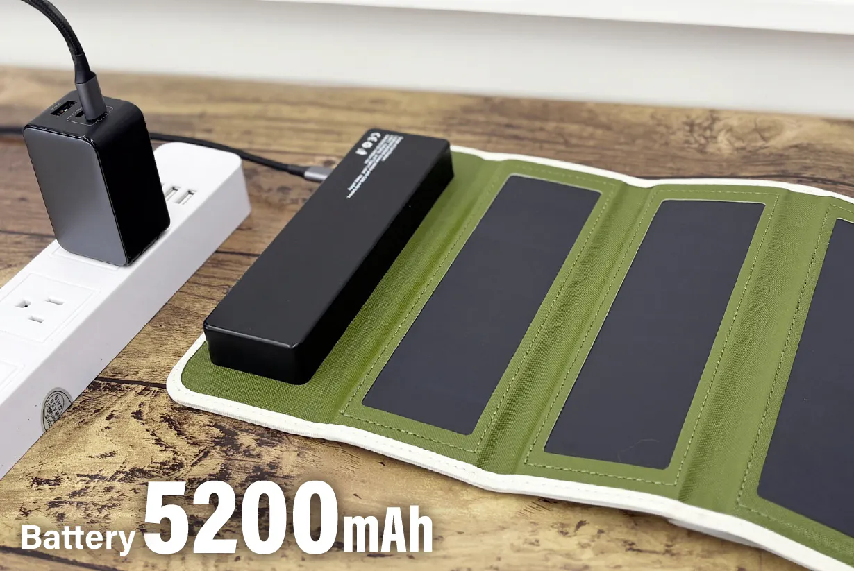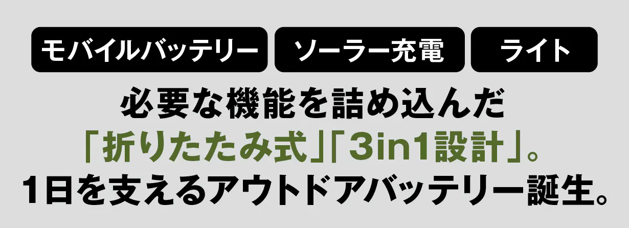 モバイルバッテリーを充電するためのソーラーパネルは一体化した折りたたみ式。
