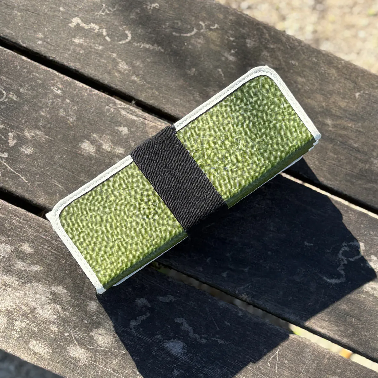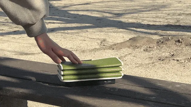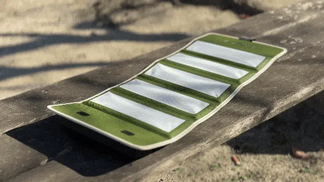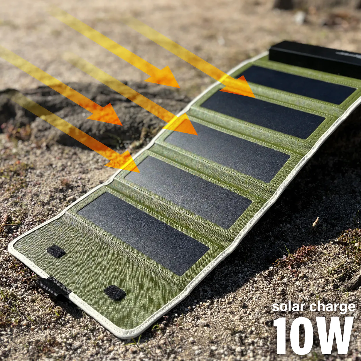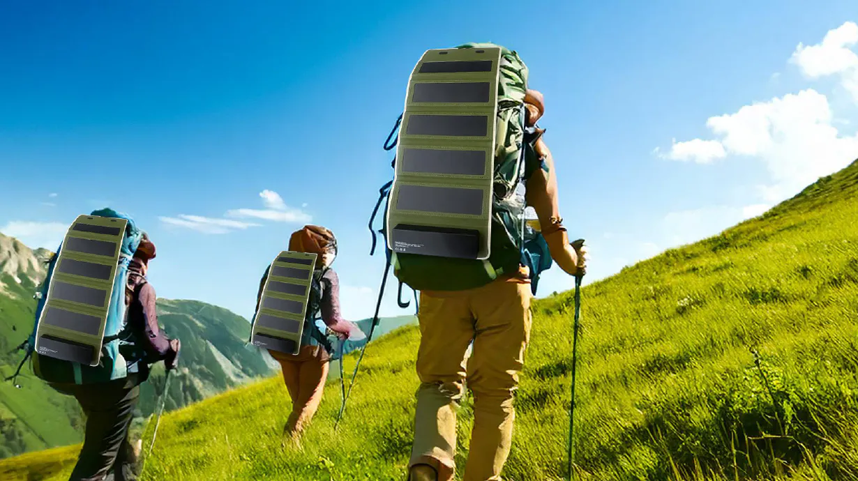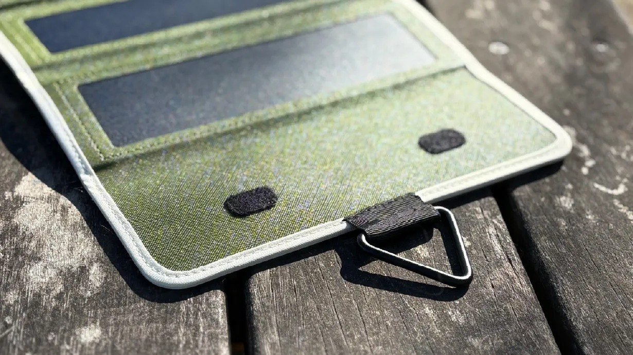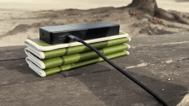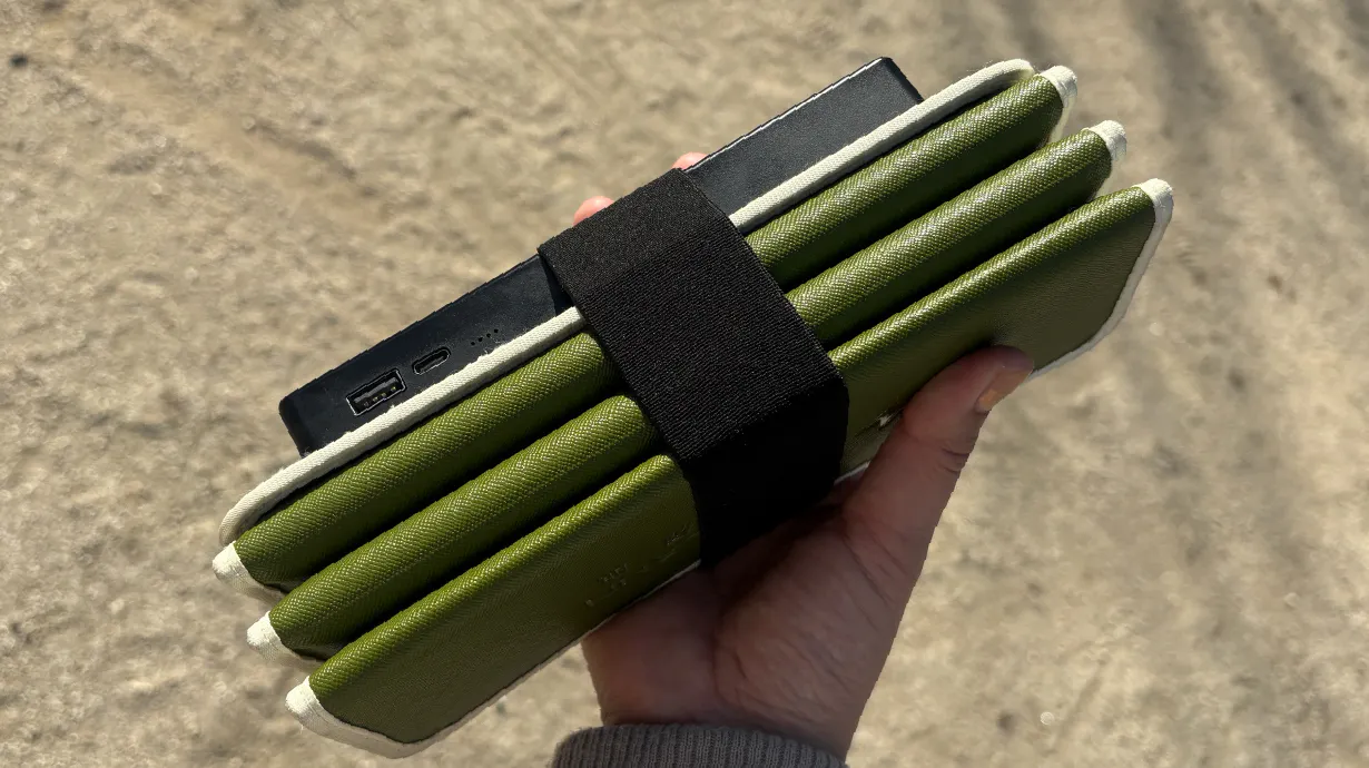 モバイルバッテリーを充電するためのソーラーパネルは一体化した折りたたみ式。