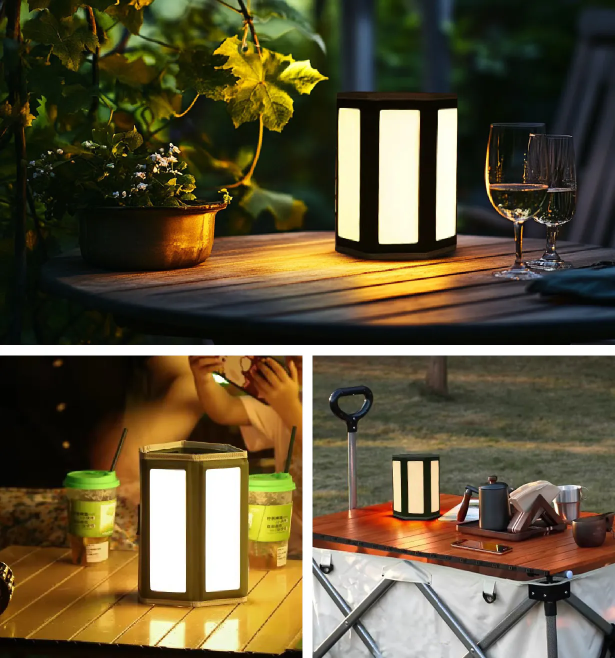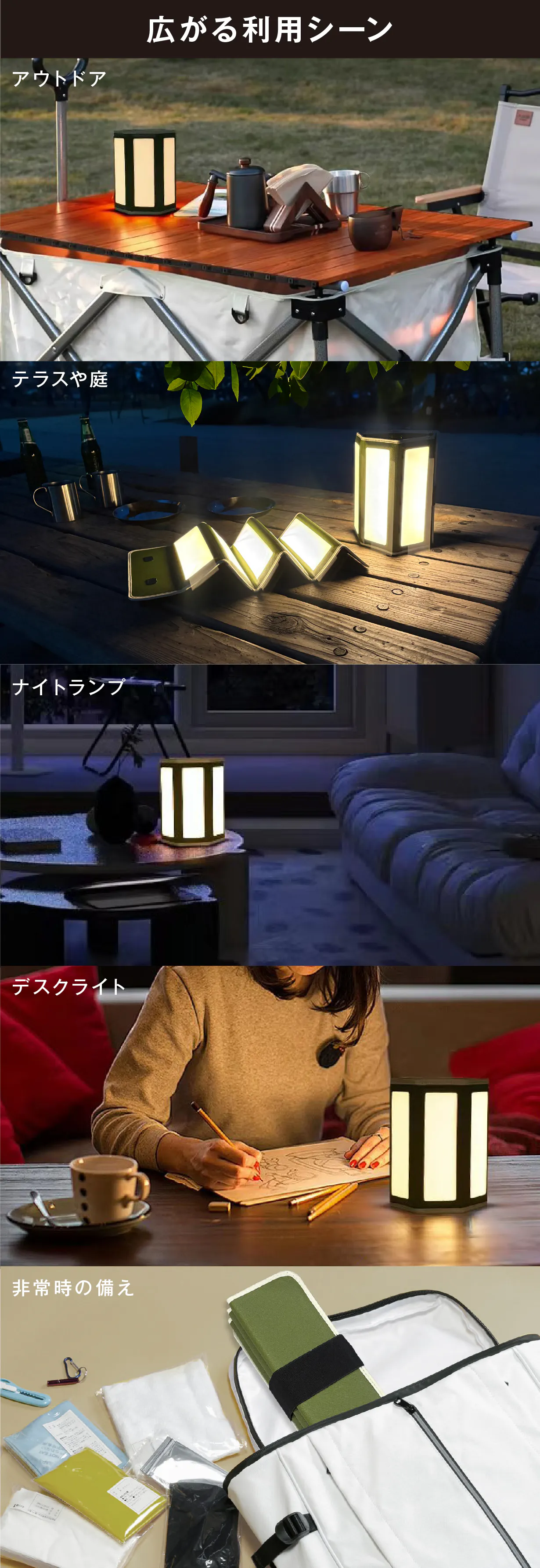 六角形や三角形、ジャバラ状、そのまま寝かせても使えるマルチなライトになります。