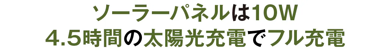 10Wの発電量で快晴時なら約4.5時間でバッテリーをフル充電できます。