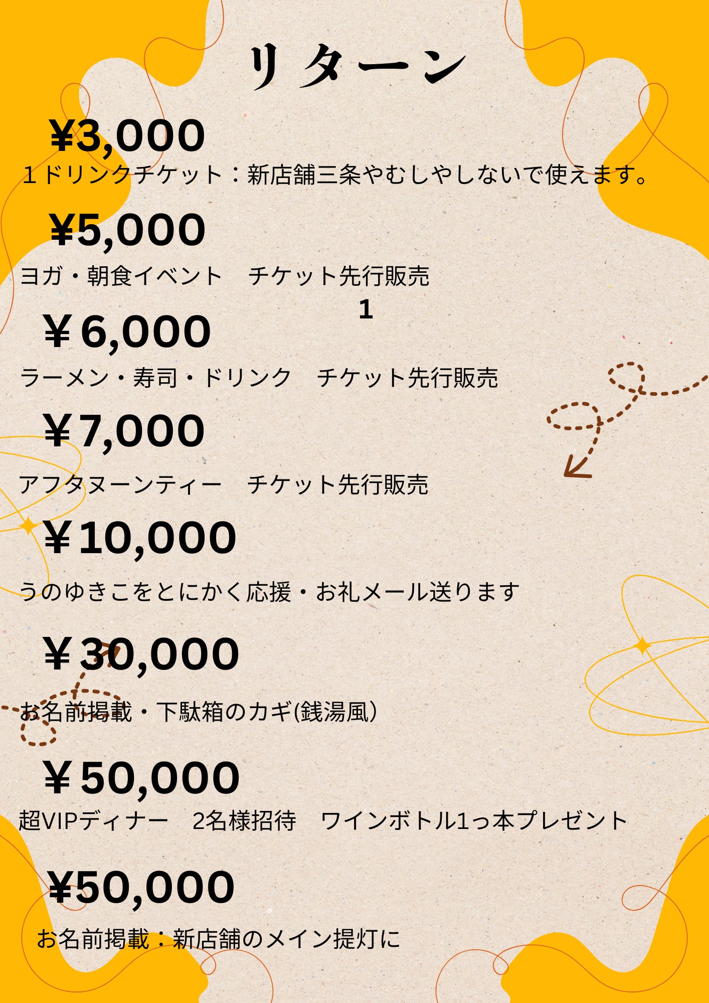 支援していただいた方には、リターンを通じて新店舗オープン後に感謝の気持ちを形にしてお届けします。皆さまの応援で、3店舗目を成功させ、アレルギーや宗教的制限のある方も“同じ卓”で笑顔を咲かせる場を広げましょう!