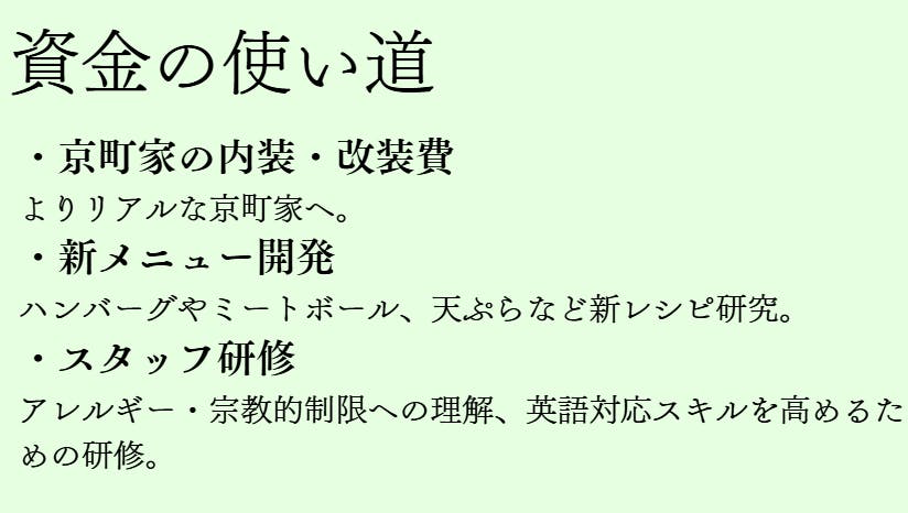 京都ならではの町家空間で、よりリアルに本物の食文化を感じてもらうーーしかし、この新店舗の立ち上げには相応の資金が必要。そこで、社会課題解決型クラウドファンディング「GoodMorning」にて、皆さまからのご支援をお願いしたいと思います。
