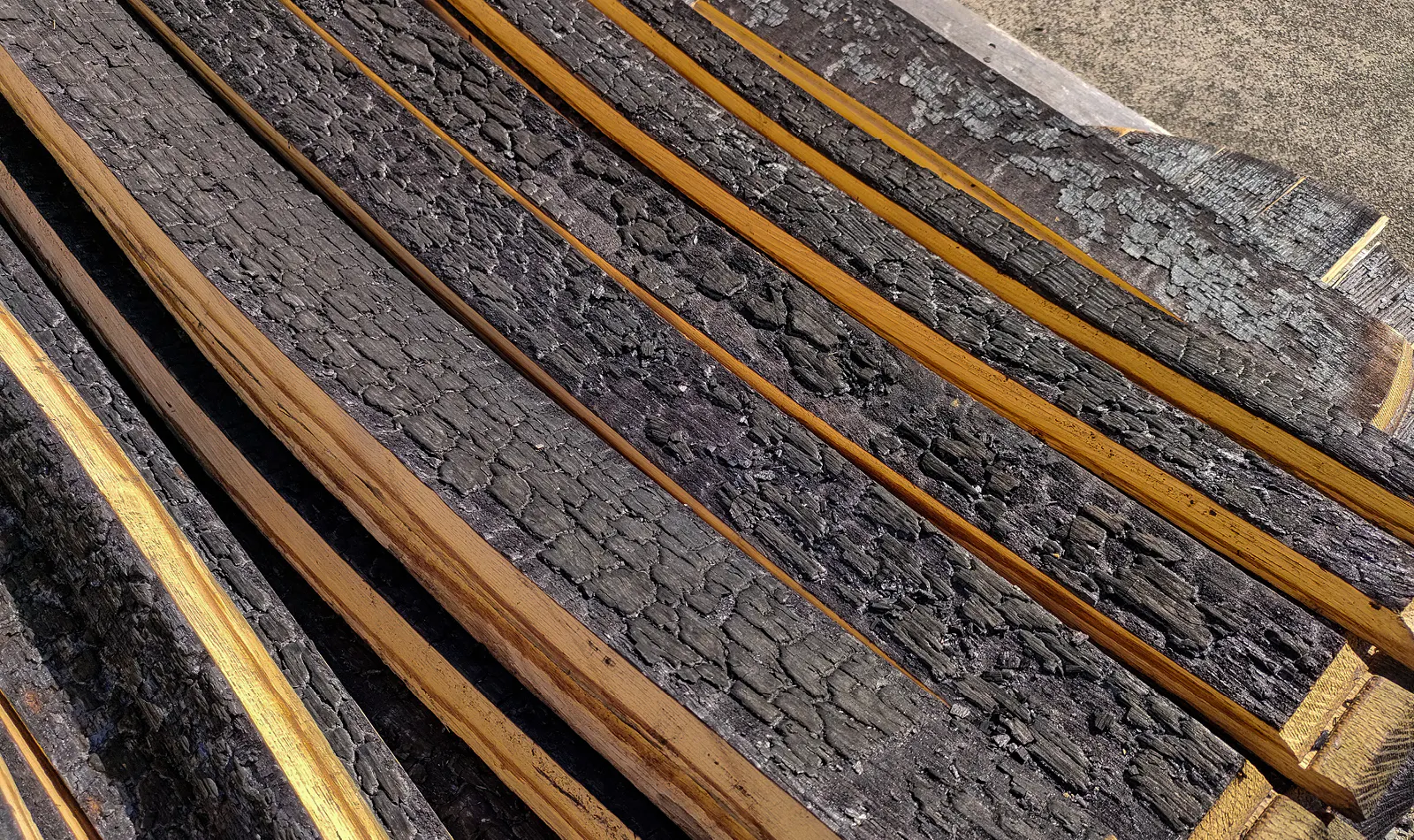 今回素材にしたのは、国内の著名蒸留所で人気ウイスキーの熟成に使用されていたウイスキー樽。何十年もお酒を貯蔵し、芳醇なお酒の成分が染みこんだ樽材です。