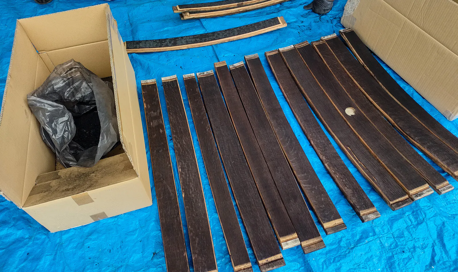 今回使用する樽材は、何年も使用されて割れが出たものや何度も削られて薄くなったものなど、廃棄予定の物を使用。焦げた部分を削り落としたうえで、熟成に必要な成分が残っている部分だけを使用しました。
