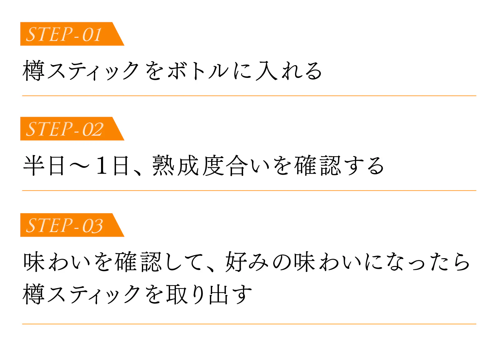 樽スティックはお手持ちのボトルに入れて使用が可能。ボトルに入れるだけなのでで、より手軽に熟成酒の味わいを楽しめます。3~7日程度漬けると変化を実感いただけると思いますが、長く漬けておくほど、味わいが変わり、あなただけの極上の一杯になっていきます。