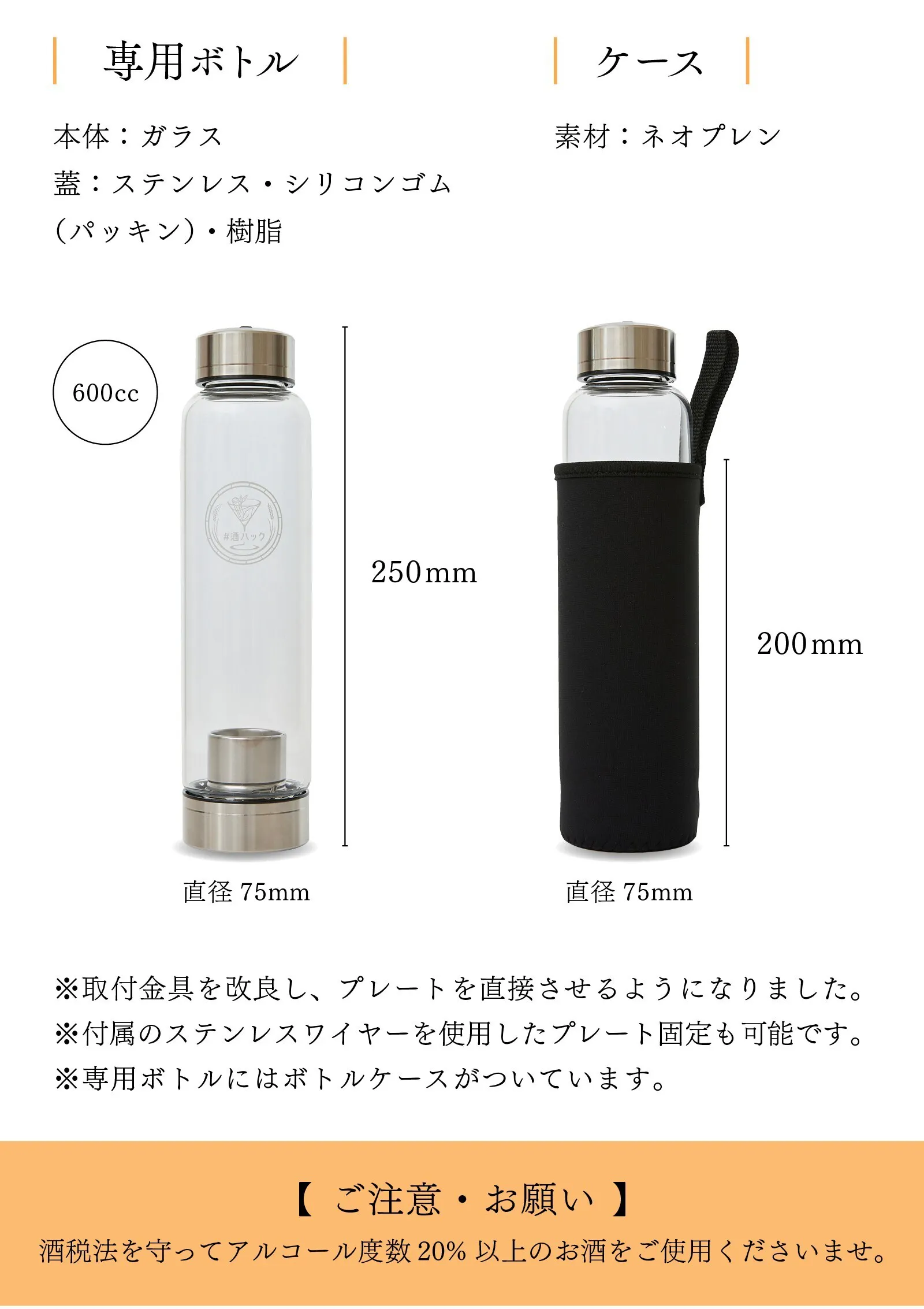 樽プレートは専用ボトルにセットして使用します。特大サイズでお酒に触れる部分が多いので、短時間でまろやかな風味に熟成します。お酒をボトルに入れれば、1~3日で樽材から成分が染み出し、驚くほどの味わいがグレードアップ。長く漬けるほど、味わいに深みがでて美味しくなっていきます。
