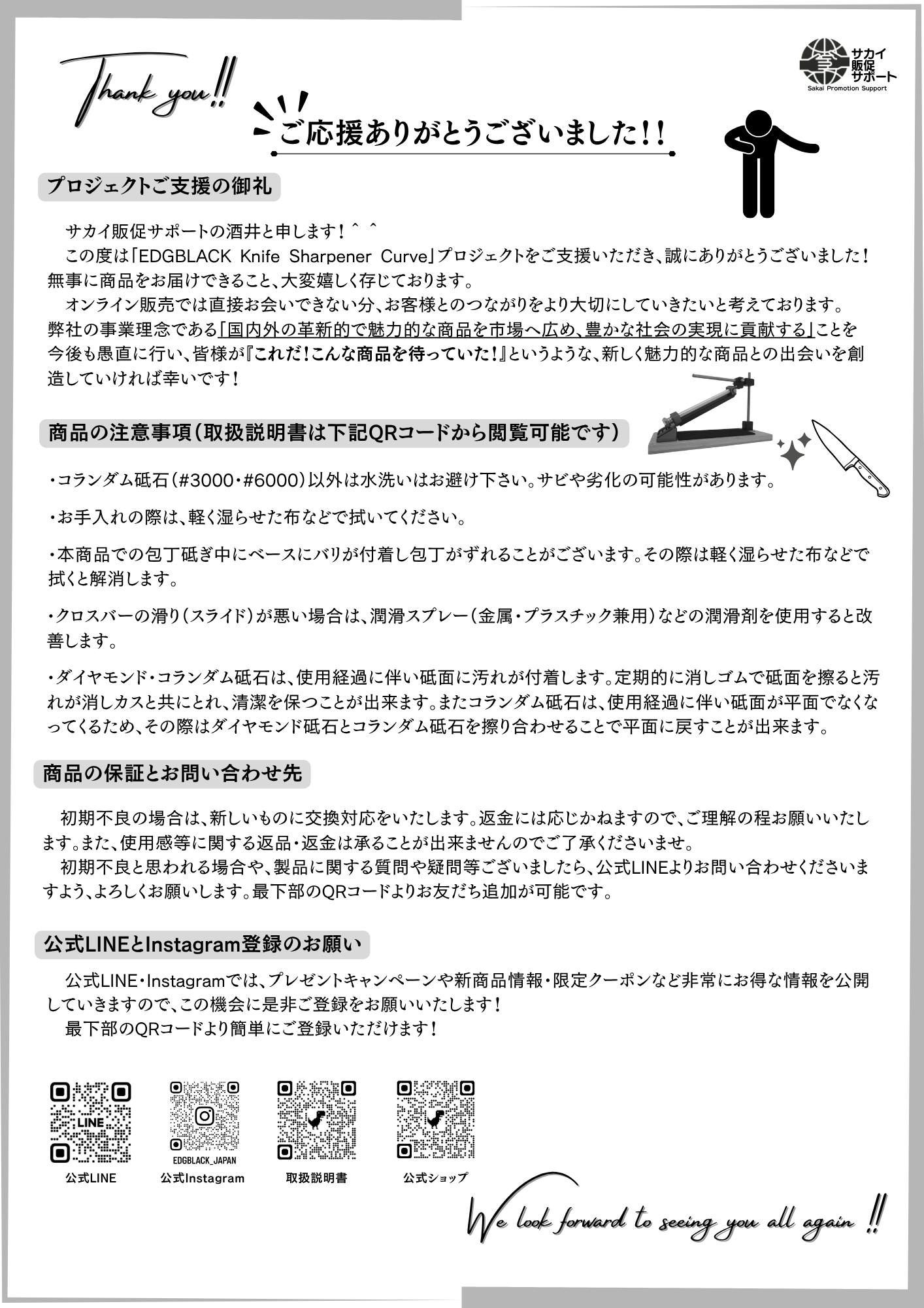 2025/07/09 17:31【EDGBLACK Knife Sharpener Curveプロジェクトご支援者の皆さまへ】お世話になっております!サカイ販促サポートの酒井です^^EDGBLACK Knife Sharpener Curveの応援購入いただいたサポーターの皆さま、大変お待たせいたしました!前回の活動報告にて発送が後ろにずれ込む可能性がある旨ご連絡差し上げておりましたが、本日全ての梱包が終了し全てのサポーターの皆様へ商品発送が完了いたしました!配送業者は佐川急便となります。早い方は明日より、順次皆様のお手元に届きますので暫くお待ちいただけますと幸いです^^地域によっては届くまでにお時間がかかってしまう可能性もございますのでご了承ください。何かご不明点やお困りの点がありましたら、お気軽に弊社公式LINEまでご連絡くださいませ!商品が届いてから、上手く包丁が砥げない、そもそもの組み立てが上手くいかない、ということなど何でもご相談ください。■公式LINE: https://lin.ee/ftmWdoR取扱説明書に関しまして、皆さまがネットから簡単にご確認いただけるように、またQ&Aなど新たな情報があったら直ぐに更新が出来るように、ダウンロード用の取扱説明書をご用意させていただきました!印刷してご利用いただくことも可能です!勿論、簡単ではございますが商品にも取扱説明書は同梱しておりますので、ご安心くださいませ。↓URLは以下の通りです。https://drive.google.com/file/d/1_PbRtd-NLwWr18J96NJeEDkAPYohICtm/view?usp=sharing最後になりますが、皆さまの手元に「EDGBLACK Knife Sharpener Curve」が無事に届き、愛用の包丁やナイフを砥ぎあげ、鋭くなった切れ味を料理や趣味の中で体感している姿を想像すると、非常に胸が熱くなる想いでございます...!!是非、知人やSNSなどで未だ本商品を知らない方へこんなに良い包丁研ぎがあるんだということを是非お知らせいただけますと幸いです^^これからも『国内外の革新的で魅力的な商品を市場へ広め、豊かな社会の実現に貢献する』という事業理念のもと、益々尽力してまいります!今後とも温かいご支援とご愛顧を賜れますよう、心よりお願い申し上げます^^ もっと見る【ご報告とお願い】リターン生産・配送状況とお届け先住所確定について