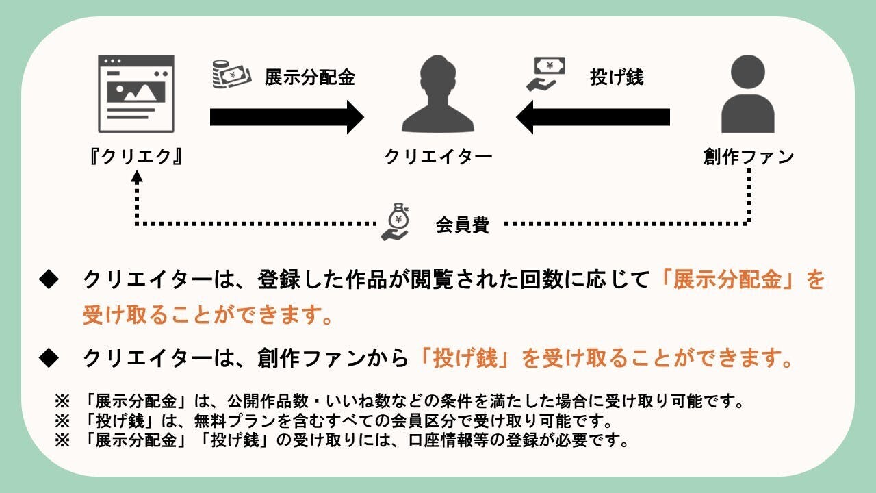 一方、『クリエク』では閲覧時に表示される広告の収益(または支払った会員費)が、クリエイターに応援として届きます。