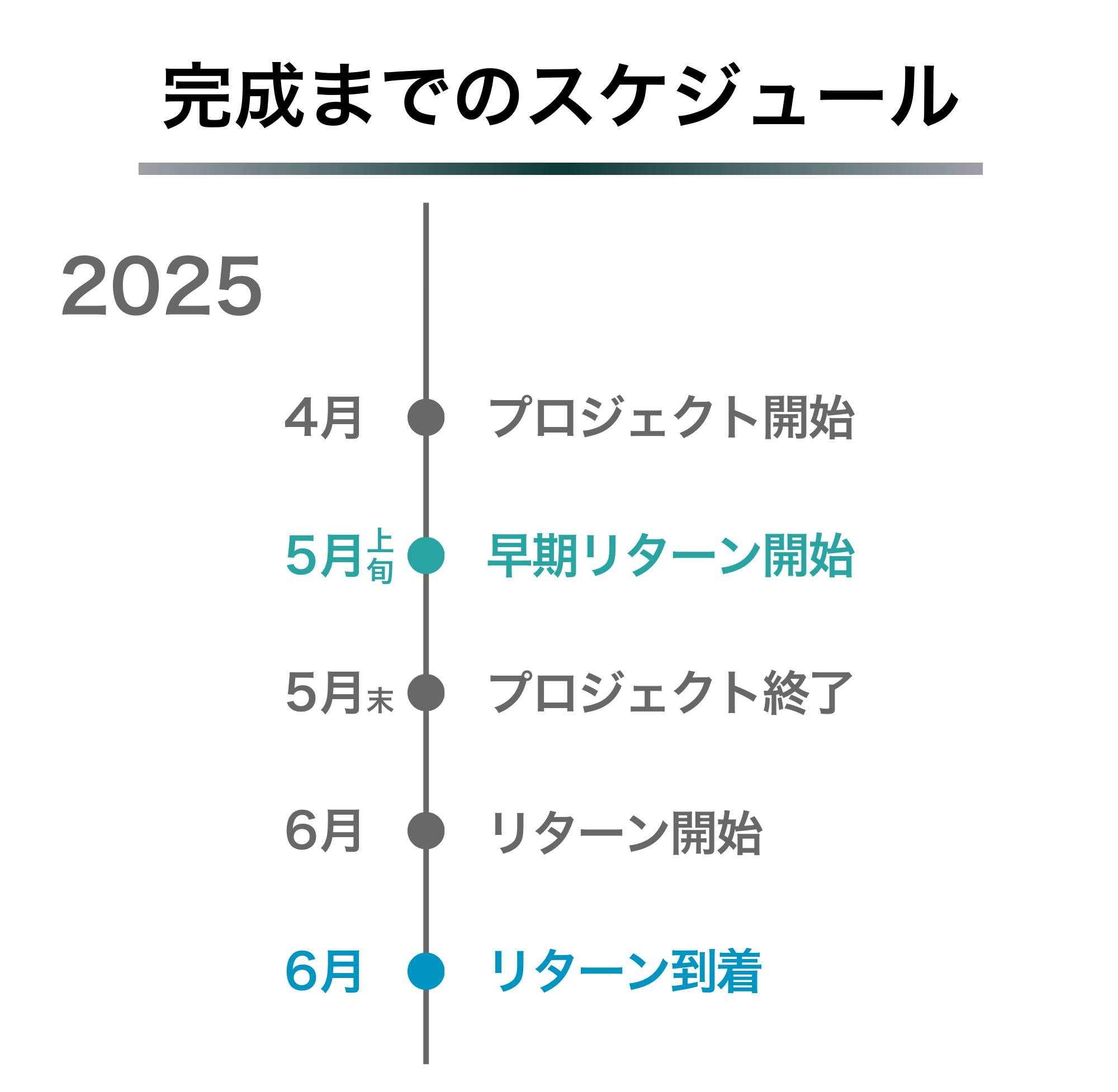 ※本文中に記載させていただいたスケジュールは、あくまでプロジェクト公開時点の予定です。クラウドファンディングを経て輸入を行う性質上、配送遅延のおそれがございます。