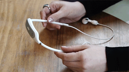 支払い時や、急に人に話しかけられたとき等、周囲の喧騒によっては両耳イヤホンでは聞き取りづらいことも。「air neck charge」なら、首にかけたまま片耳イヤホンをキープできます。
