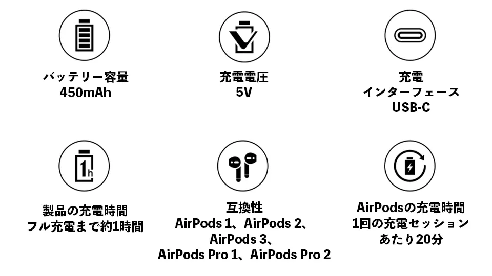 ◯バッテリー容量: 450mAh(AirPodsへ4〜5回充電できます)