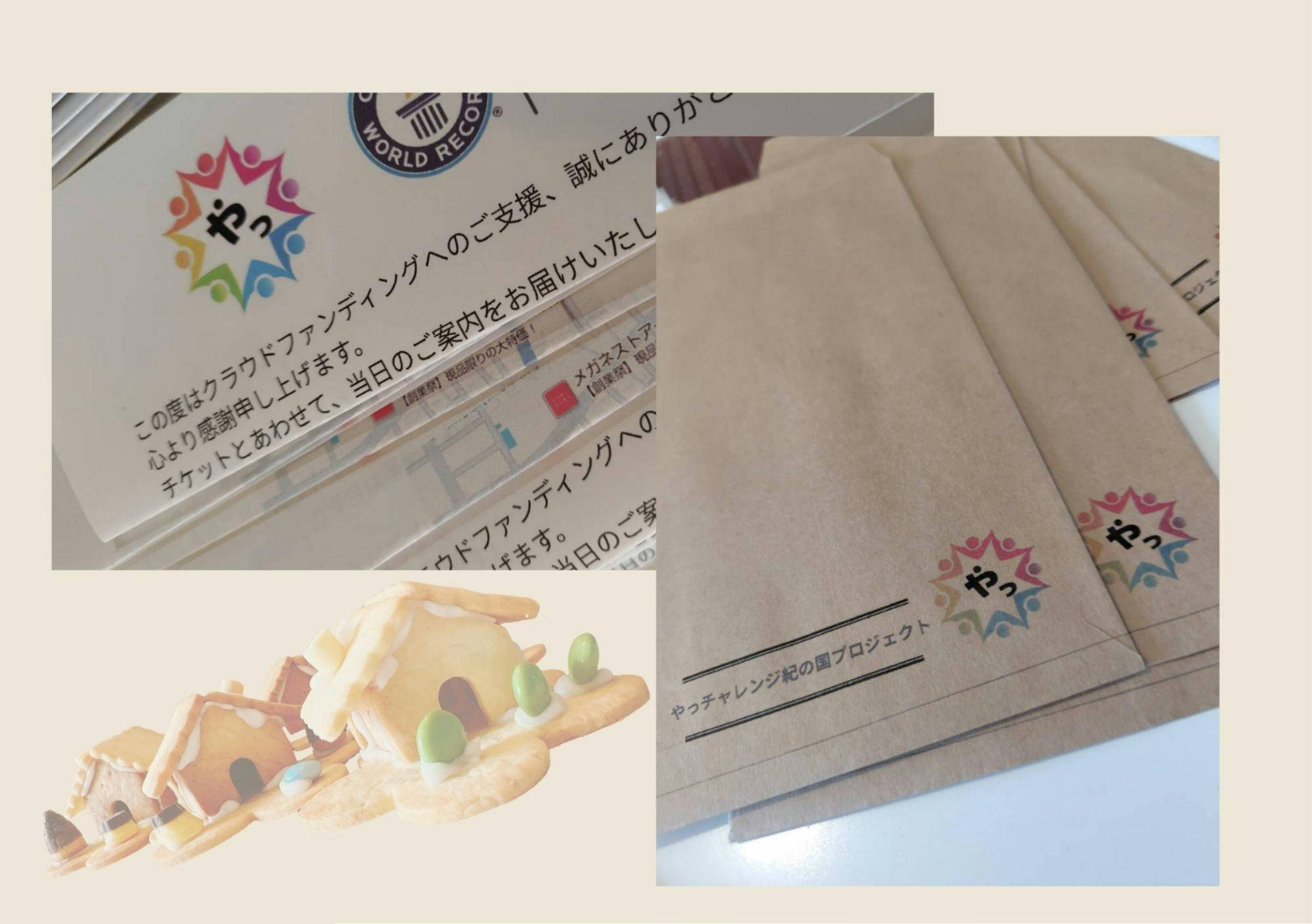 ⑥ 8000円コース 10月19日へ1名様参加券(小学3年生以上の方対象)+後日当日の映像が見れるURL+もう一つ選べるコース(次よりお選びください) A お菓子の家クッキーを焼くメンバーにご招待 B お菓子の家クッキー組立てメンバーにご招待 C 子ども料理教室体験レッスンへご招待 D 大人の料理教室へご招待 E 世界記録達成ロゴ入りやっチャレンジ紀の国プロジェクトオリジナル認定証付