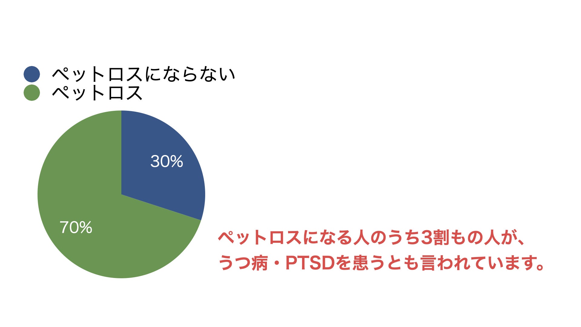 そのうち、伴侶動物の死後、7割もの人々がペットロスになり、3割の人がうつ病やPTSDを患うと言われております。60代以上の高齢者の4割が「ペットが唯一の話し相手」と回答しております。