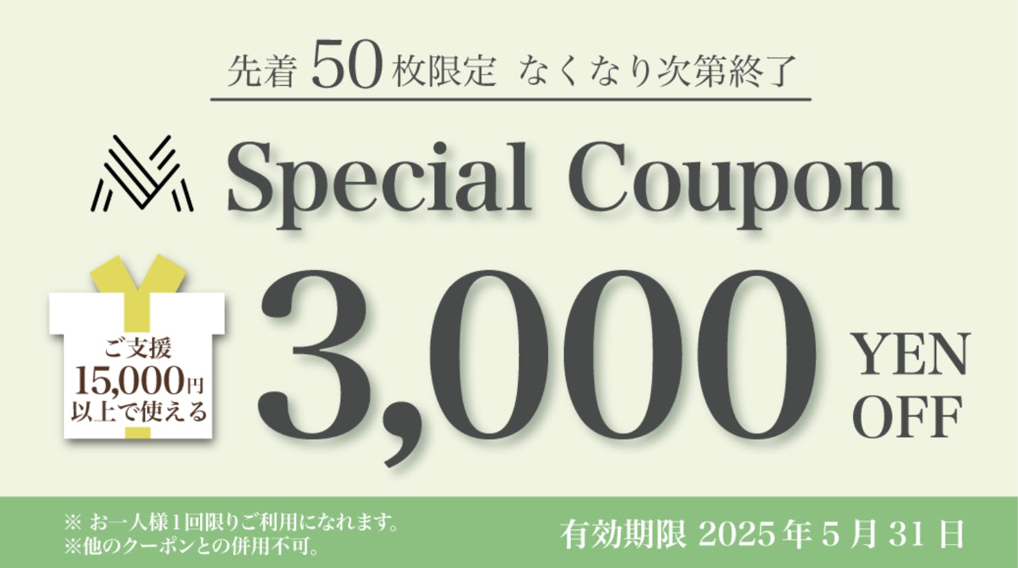 2025/05/26 10:32TIDY2.0 machi-yaモデルをいいねしてくださっている皆様へリターンがさらにおトクにクーポンで最大3,000円OFF!配布枚数:先着50枚(期間中1人1回まで使用可能)クーポン利用期限:2025年5月31日(土)23:59クーポン金額:3,000円OFF(支援金額15,000円以上)適用サービス:machi-yaのみ【クーポン取得方法】 CAMPFIREアカウントにログインした状態でバナーをクリックでクーポンが取得可能。未ログイン状態の場合はログイン画面に移動します。>> クーポンご利用方法の詳細はこちら※複数クーポンの同時使用NG※上限枚数に達した場合はご利用いただけません。予めご了承ください。 もっと見る