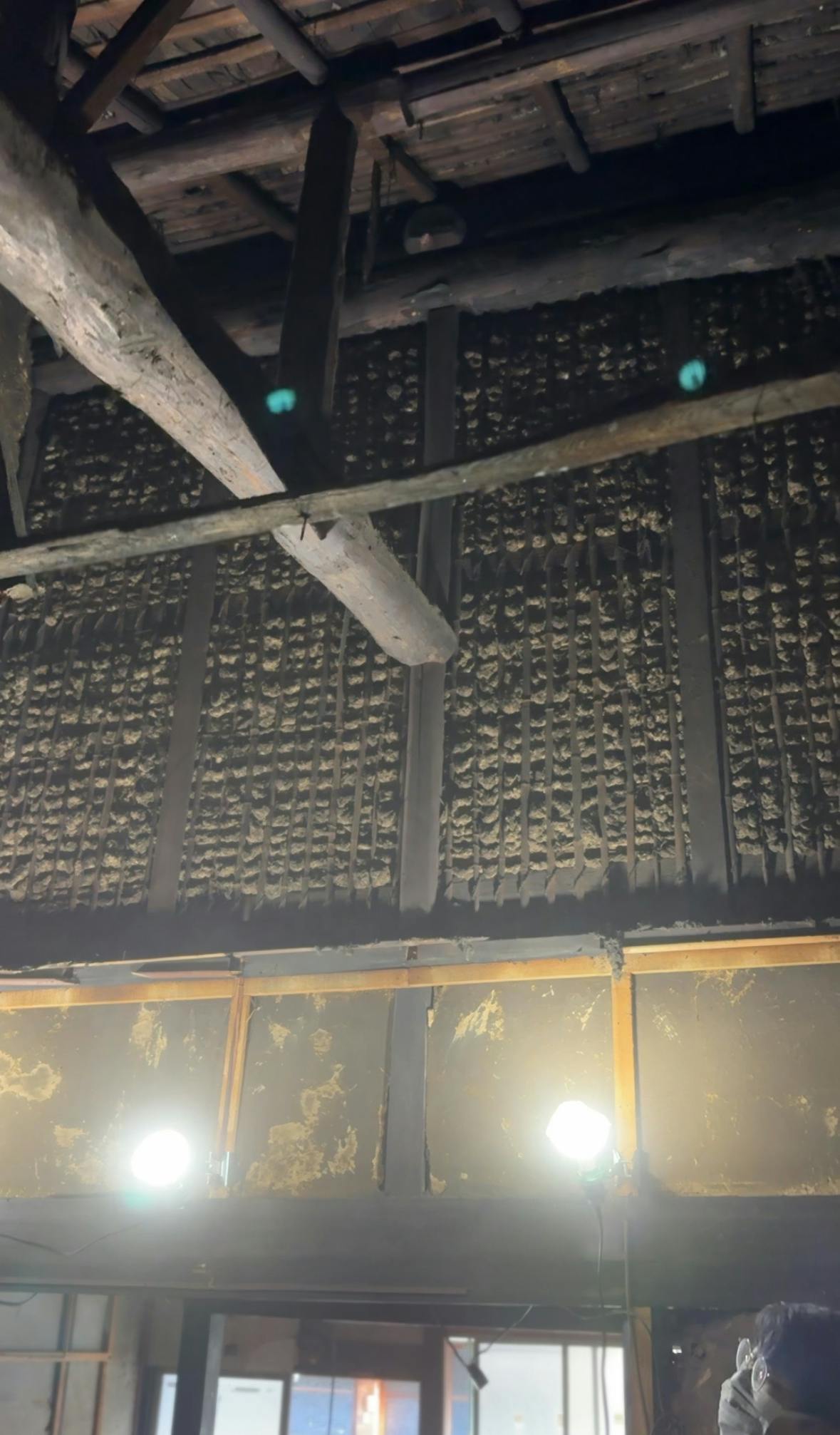 2025/05/04 08:56Day30第Ⅰ期の解体も残りわずか。いよいよ残っていた奥の部屋の天井をめくってみました!この部屋は元々天井が高く、脚立を使って慎重に作業。いつも天井からは大量の砂ぼこりが落ちてくるので、体と心の準備をして、いざ!案の定、戦場のような砂煙りに覆われましたが、天井が無くなると立派な屋根裏が!!宮大工さんから杉皮が使われた屋根裏は珍しいと教えられたからか、雨漏れしていない屋根が見えたからか、うっとりするくらい綺麗な屋根裏に感動しました! もっと見る