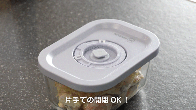 A:食材を適量入れ、蓋をしっかりと閉めて密封してください。容器が満杯だと真空保存が難しくなるため、少し余裕を持たせて保存してください。