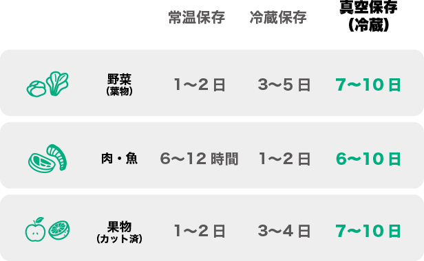 食材を適量に詰めることで、真空状態がうまく作れます。容器に余裕を持たせて保存し、鮮度を長期間保ちましょう。