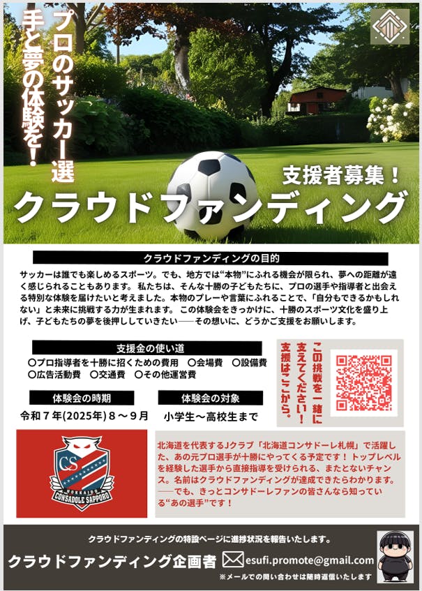 2025/04/23 22:24このたび、子どもたちにプロのサッカー指導を届けることを目的とした体験会の実施に向け、クラウドファンディングを正式に開始いたしましたので、ご報告申し上げます。合わせて、プロジェクトの内容や想いをより多くの方に届けられるよう、チラシも作成いたしました。地域の掲示や配布などを通じて、多くの方にご案内できればと考えております。クラウドファンディングページには、今回のプロジェクトに込めた想いや、支援の使い道についても詳しく記載しております。よろしければぜひ一度ご覧いただけますと幸いです。 もっと見る