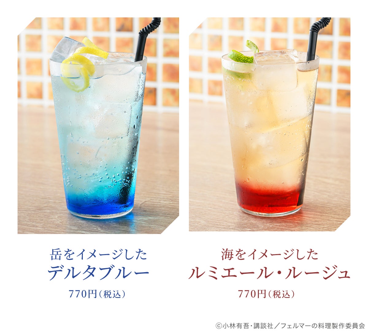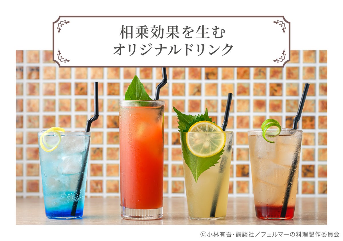 料理に加えて、全4種類のオリジナルドリンクもご用意しました。原作で印象的だった「相乗効果」から着想を得たドリンクに加え、岳と海をそれぞれイメージした特別なノンアルコールカクテルも。ぜひ料理とあわせてお楽しみください。