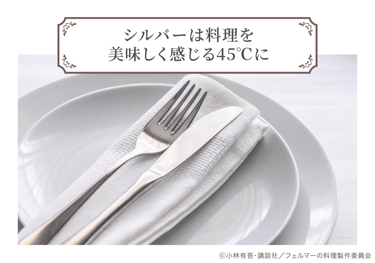 原作でも印象的だった、フォークの温度。岳のお店では当然これは外せないだろうと思い、再現を決めました。洋食を食べる時、岳にとっては当たり前のことだった「熱い」と「温かい」の境目になる45℃のシルバーで食事をお楽しみください。