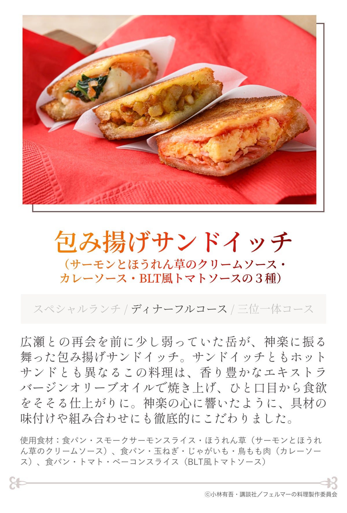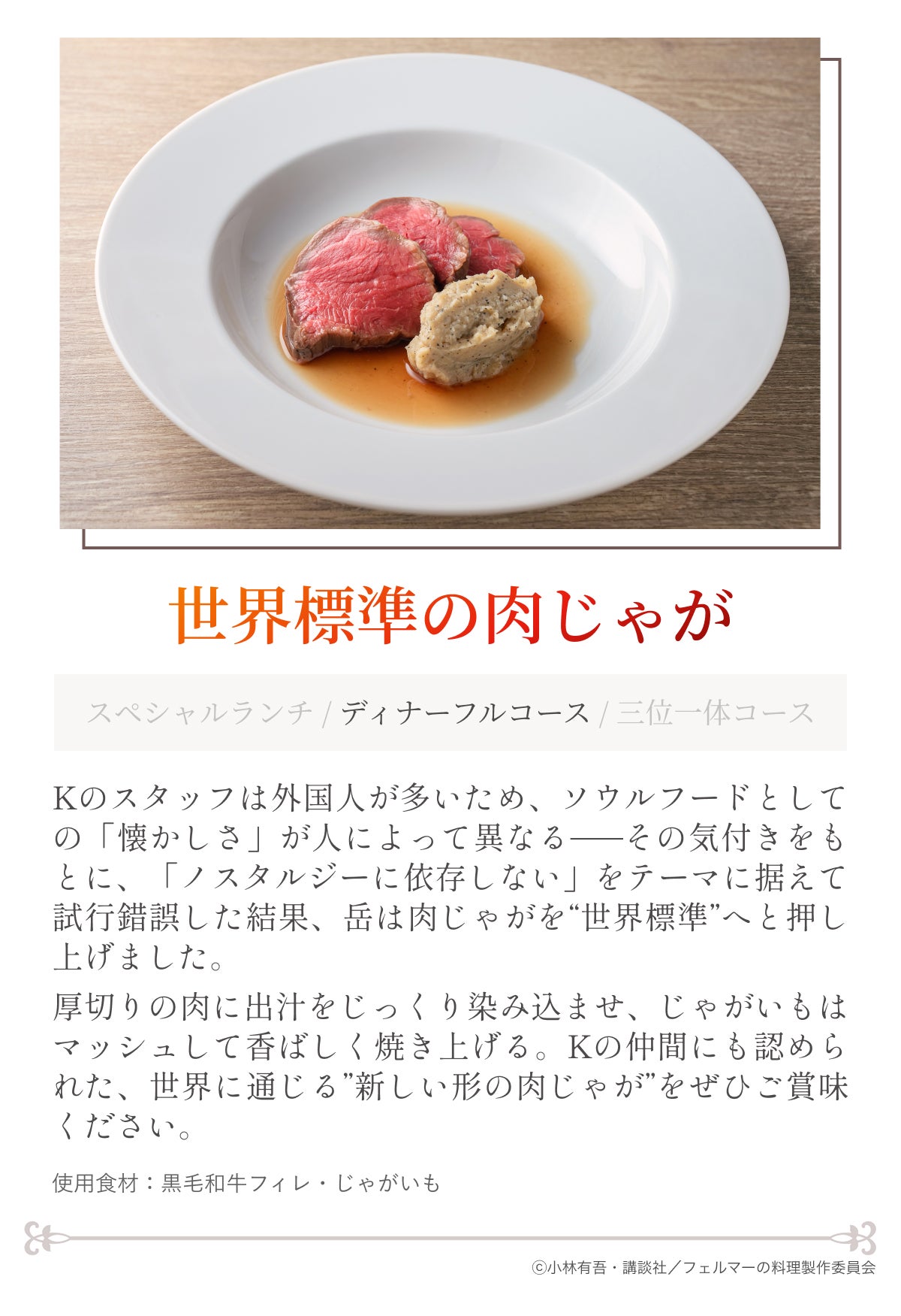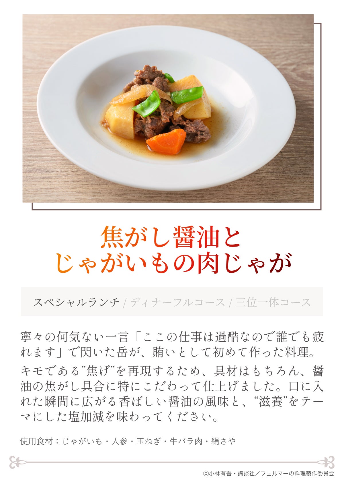 岳が作中で初めて振る舞った料理「ナポリタン」、初めて作った賄い「肉じゃが」、そして「苺のタルト」へと続くコース。Kに入りたての頃の岳に思いを馳せたくなる内容です。家庭料理の肉じゃがと洋食屋の定番であるナポリタンが、「フェルマーの料理」というフィルターを通すとどのように仕上がるのか─ぜひお楽しみください。