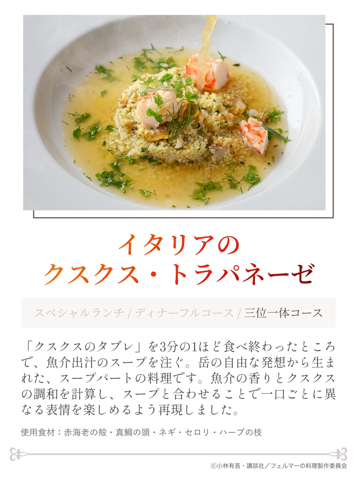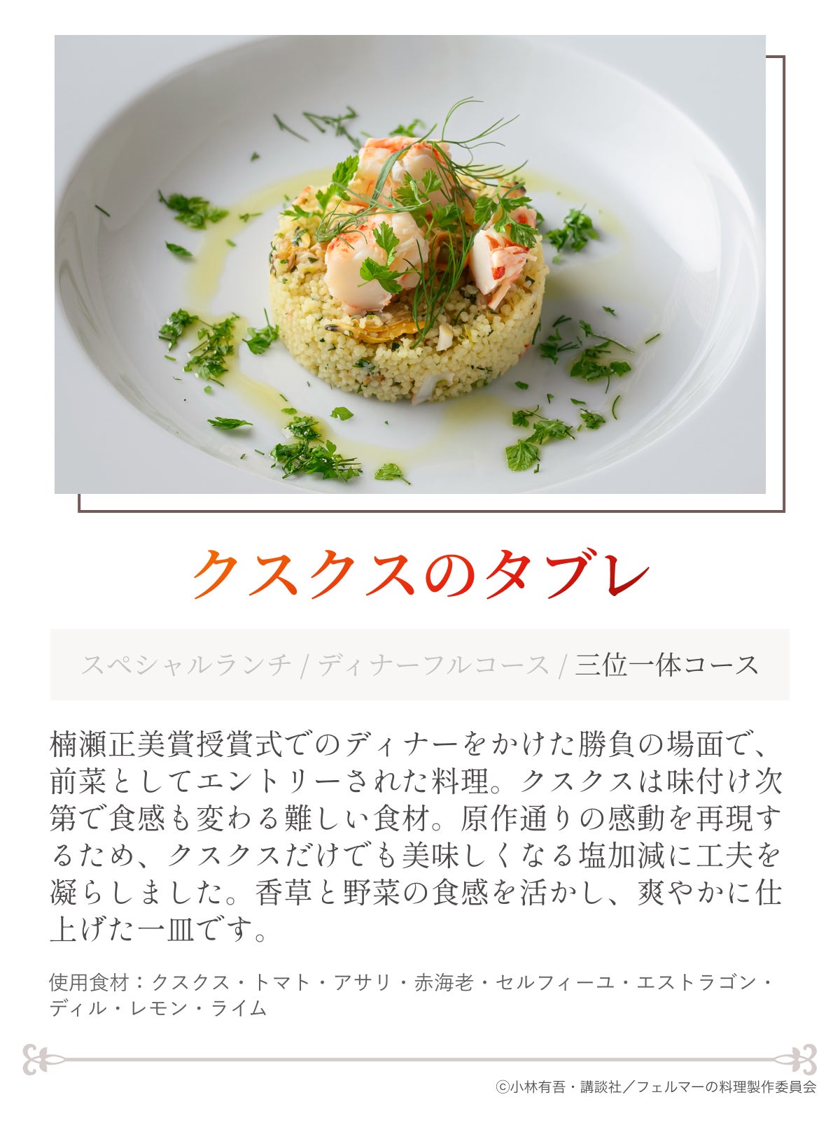 楠瀬正美賞授賞式でのディナーをかけた勝負の場面で、岳が考案したあの3品を味わえるコース。「クスクスのタブレ」にスープを合わせた「イタリアのクスクス・トラパネーゼ」、そしてカツ丼を思わせるオリジナルディッシュ「スパイスとナッツのトンカツ」。異なる文化圏(中東・地中海・日本)を横断し、最終的にひとつの世界観へと収束する雰囲気を味わえます。