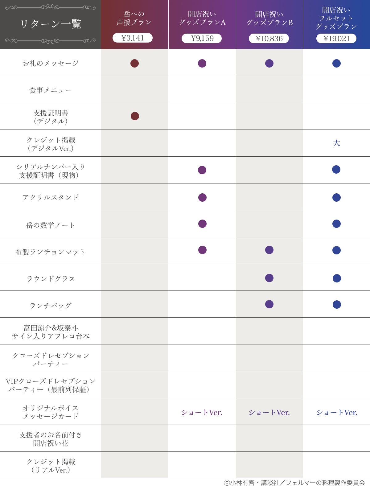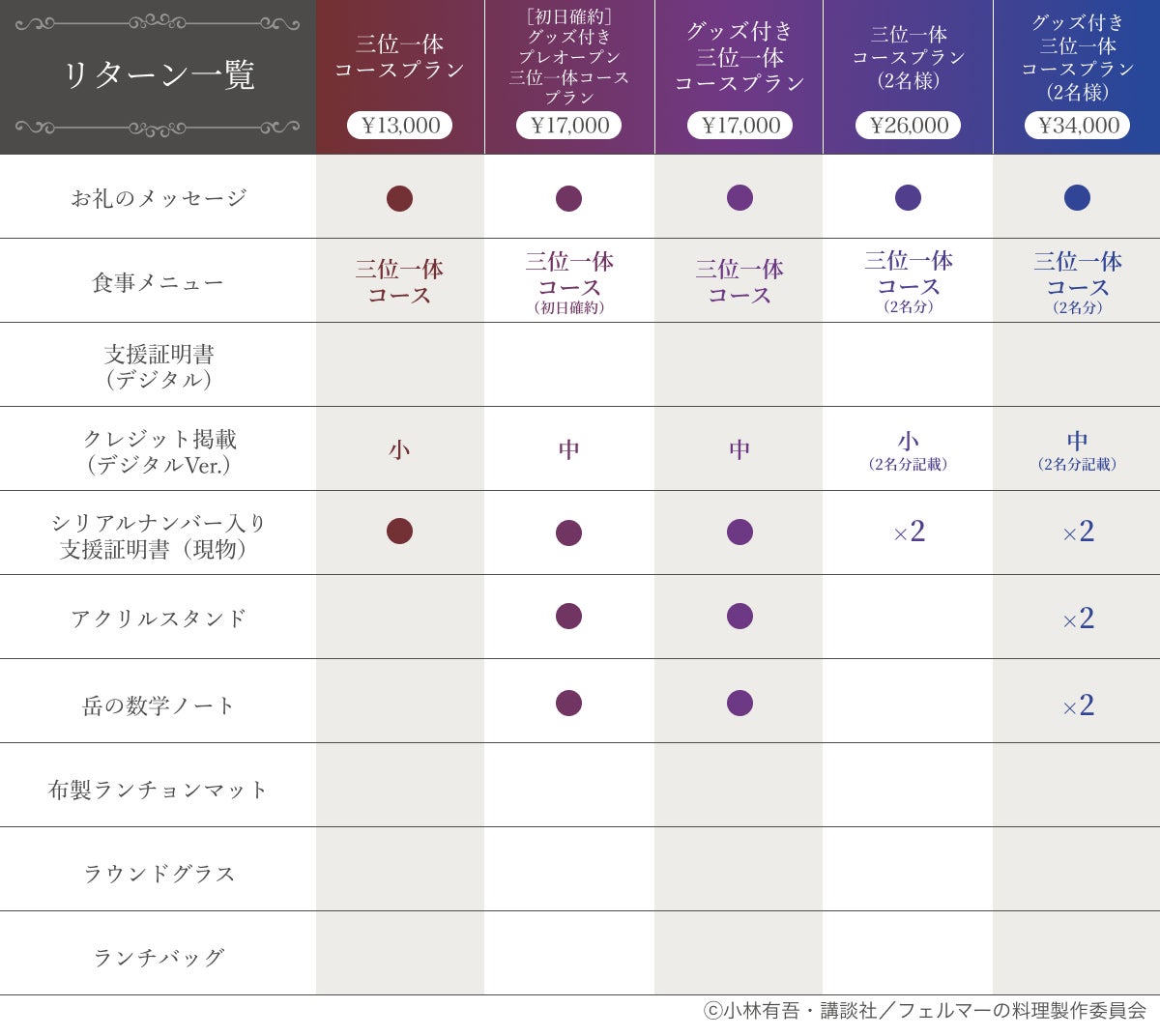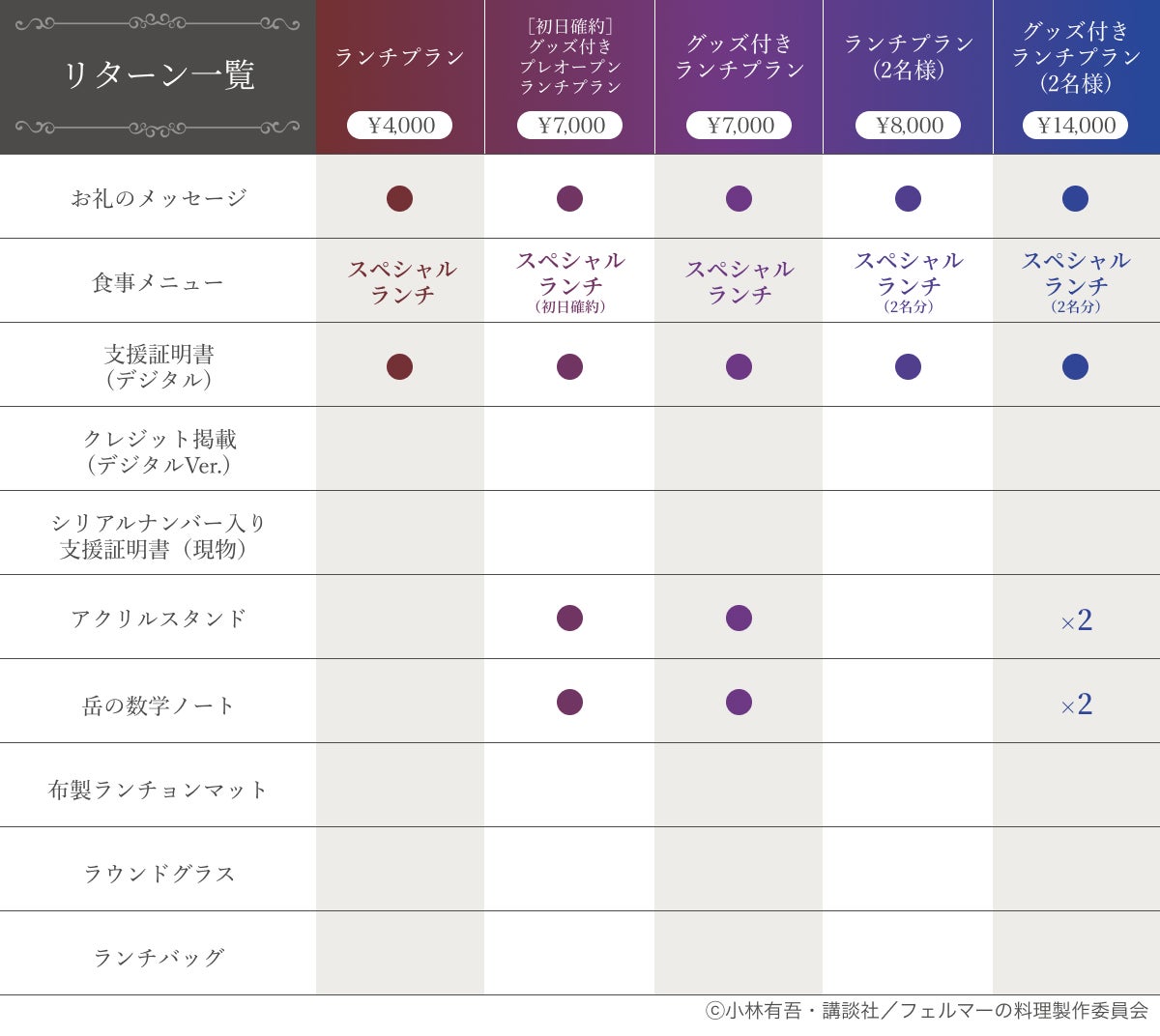 来店できる方もできない方も楽しめるように、食事付きプランの他にグッズ中心のプランも用意しました。食事プランには、通常営業日に加えて超クローズドな「レセプションパーティー枠」も!お好きなプランを選んで、この特別な企画をぜひ味わってください。