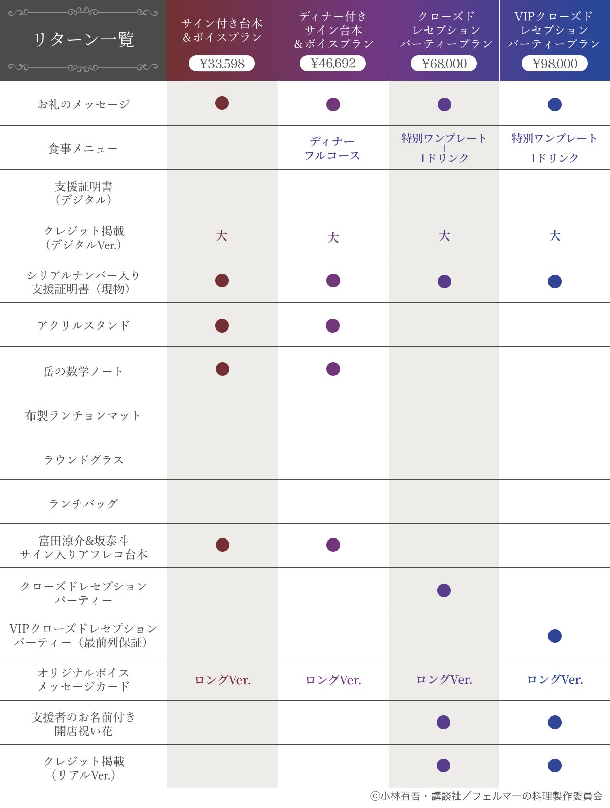 通常の予約権に加えて、オープン初日の来店が確約されるプレオープン予約権や、声優さんとのイベントを楽しめるレセプションパーティー参加権もご用意しました。それぞれ料理の形式や楽しみ方の魅力が異なります。ぜひお好みに合わせて選び、この特別な体験をご堪能ください!