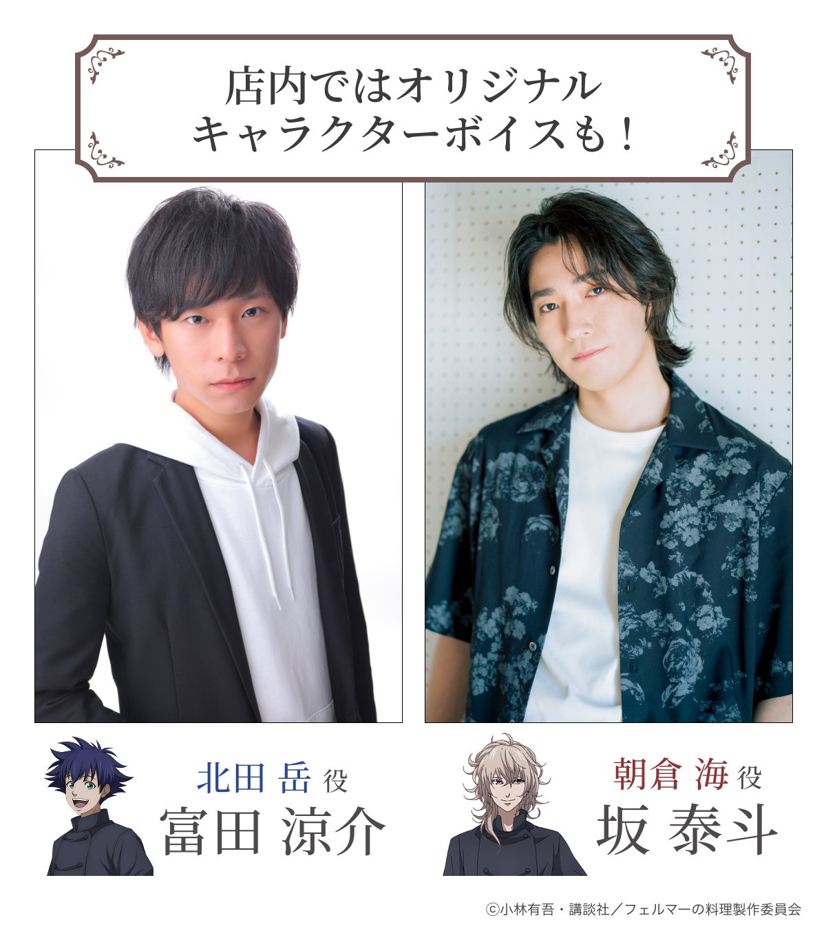さらに、店内ではキャラクターボイスを収録したオリジナル音声演出もご用意!岳役・富田涼介さん、海役・坂泰斗さんのボイスが流れる店内で、まるで本当に岳と海に出迎えられているかのような体験をお楽しみいただけます。