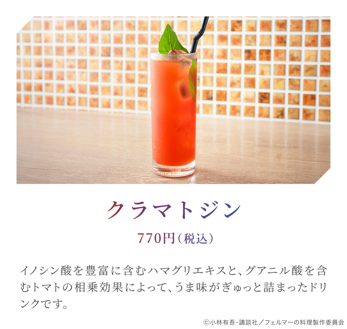 原作には登場していない「相乗効果を生むオリジナルドリンク」もご用意しました。蘭菜に振る舞われた「豚肉のミキュイ」をきっかけに、うま味の相乗効果を体得した岳。もし彼が自分の店を持つなら、料理だけでなくペアリングするドリンクにも相乗効果を求めるはず─その発想から生まれたドリンクをご用意しています。さらに、岳と海をそれぞれイメージした特別なノンアルコールカクテルも。全部で4種類のオリジナルドリンクをお楽しみいただけます。