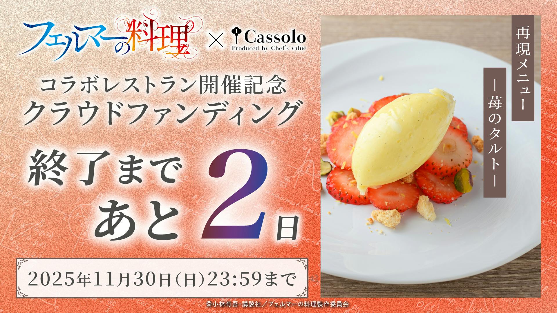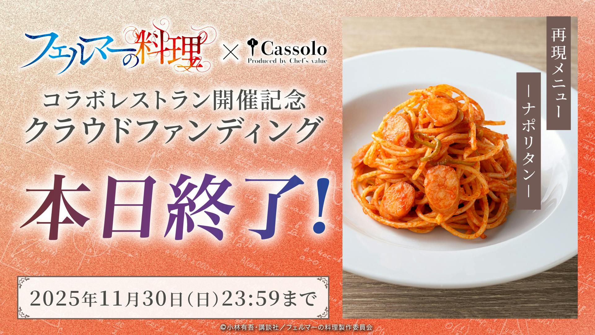 2025/11/30 00:00\クラウドファンディング本日最終日/皆さまの温かいご支援に心より感謝申し上げます。目標金額5,403,023円達成まで、残り3,837,644円!最後のひと押し、応援いただけたら嬉しいです。ページにもある通り、クラウドファンディングの枠が残った場合には一般予約も予定していますが、価格は異なります。誰よりも早く、特別価格で体験できるのは今回のクラウドファンディングだけ!「岳がKを卒業して、自分の店を出すなら」――その想いを Cassolo と共に本格レストランで実現しました!原作の“美味しさ”をリアルに体感できる夢のコラボレストラン。アトフェスとしても初めてのクラウドファンディングの挑戦です!是非ご支援いただけますと幸いです!▼プロジェクトページはこちらから https://camp-fire.jp/projects/839204/view クラウドファンディングは本日の23:59まで! もっと見る