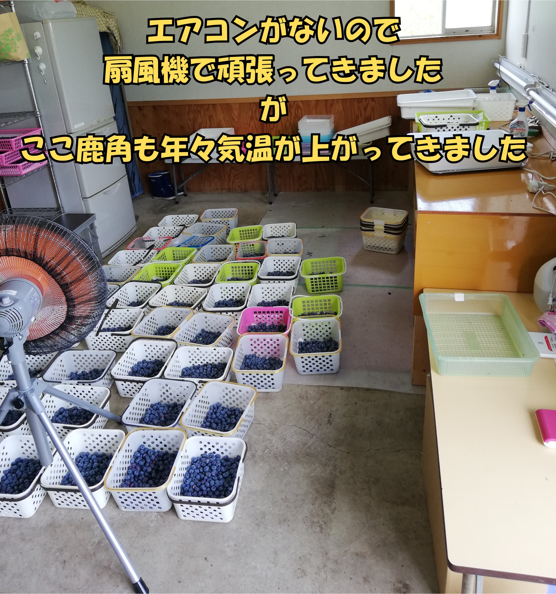そのために、基礎は60年前、建物は30年以上前に建て替えた休憩所兼選果場の大リニューアルを行い、ブルーベリースムージーが似合う爽やかで清潔な明るい空間へ生まれ変わらせます。