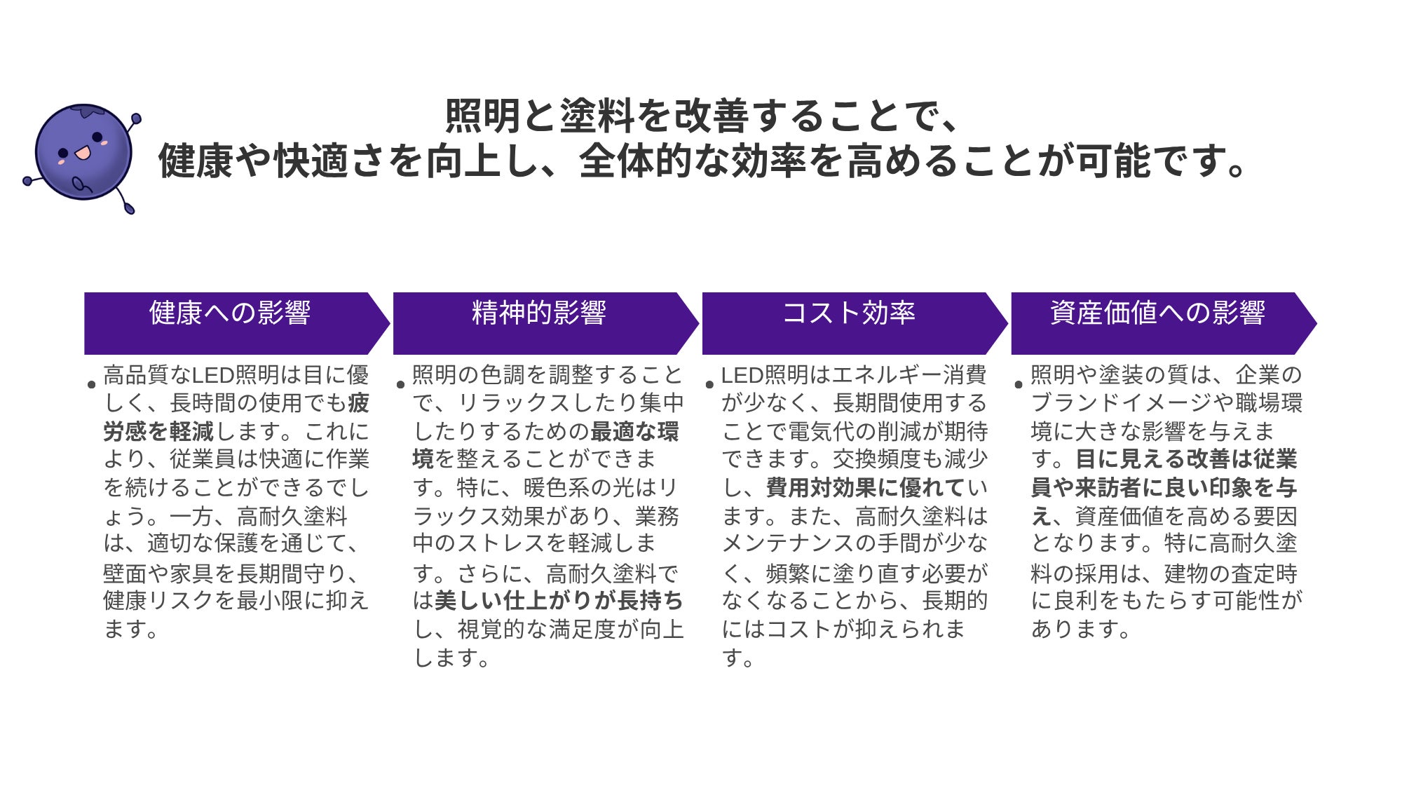 ブルーベリーを連想する楽しく温かみのある空間でゆったりくつろいでいただくと同時に、