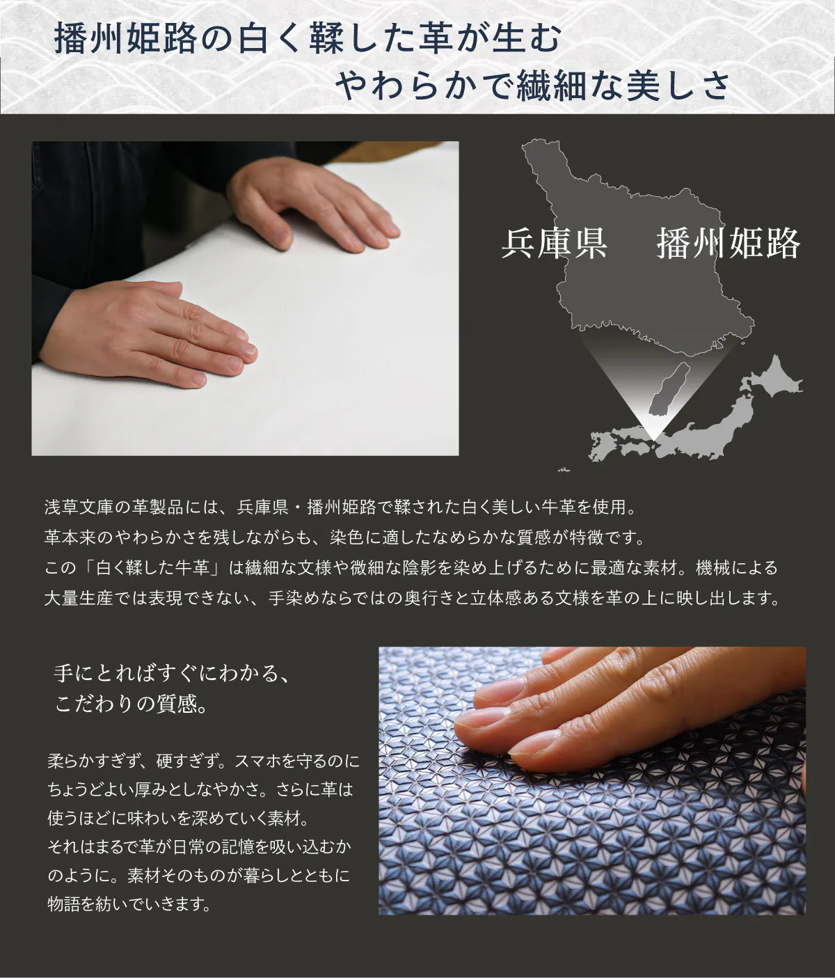 革は湿度や乾燥の影響で微妙に伸び縮みするため、その日の革の状態を職人が見極め、調整しながら圧をかけていきます。その結果、革の表面には陰影のある立体的な文様が浮かび上がり、光の加減で表情が変わる、深く美しい質感がうまれるのです。