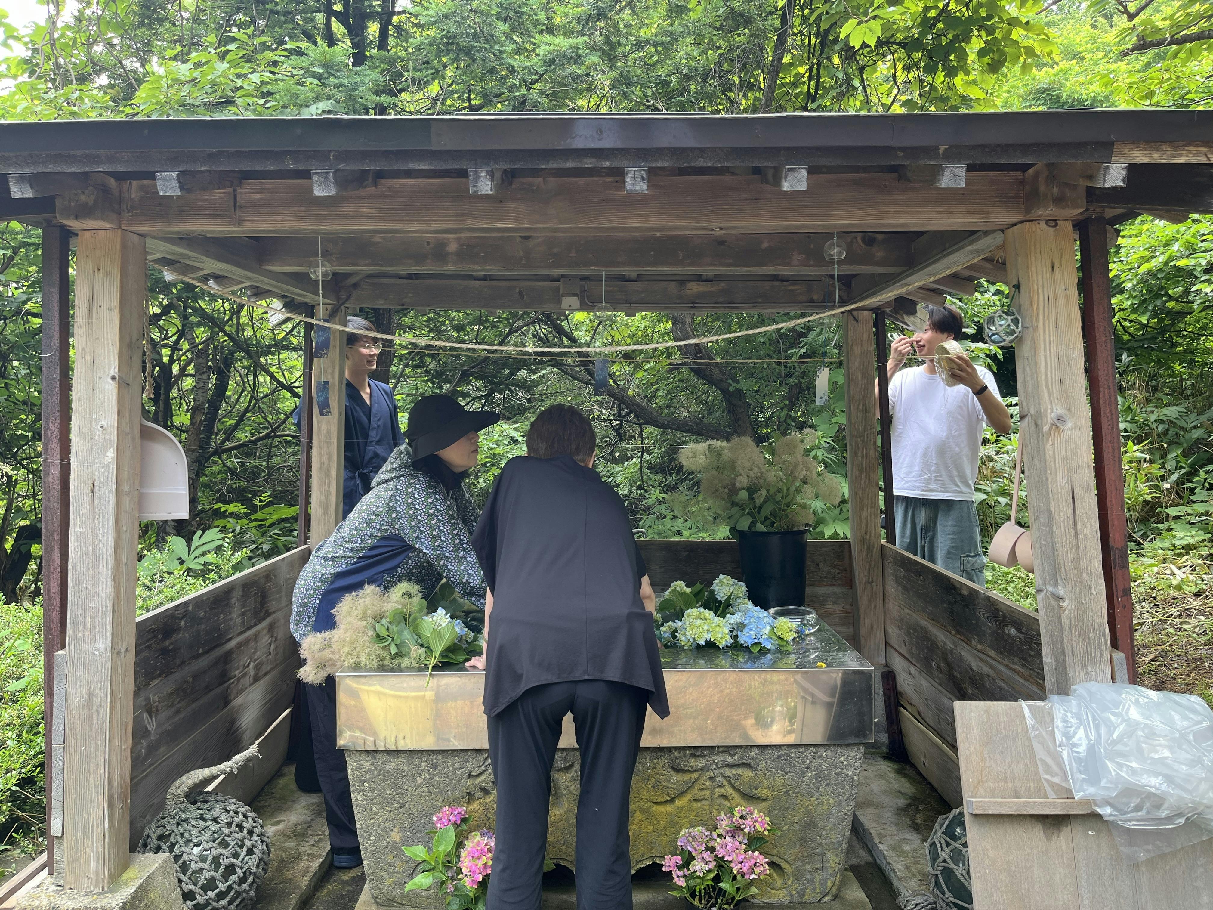 2025/06/30 17:24本日より、今年の「花手水プロジェクト」が始まりました。この取り組みは、「庭先の一輪の花を持ち寄る」ことで、地域の皆さんが気軽に祭りの準備に参加できる仕組みです。昨年も好評を博したこのプロジェクトを、今年も継続して実施しています。今年は新たに、龍の装飾をあしらった蛇口を設置し、清らかな水に花々が映える、より趣のある花手水が完成しました。地元の皆さんが持ち寄ってくださった季節の草花やミントが彩る手水鉢には、訪れた方々からも「きれい!」「涼しげで癒やされる」との声が寄せられています。花手水は、見る人の心を和ませるだけでなく、「自分も祭りの一部に関わっている」という喜びを共有できる文化的な場でもあります。期間中はどなたでもご参加いただけますので、ぜひご自宅の花を一輪お持ち寄りください。 もっと見る