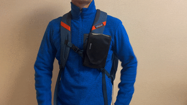 A: ポーチのストラップの滑り止め加工でずれにくい仕様ですが、よりズレにくくするためにはカラビナを併用もしくは、リュックにチェストストラップが付いていればその上側にポーチを付ければずれません。
