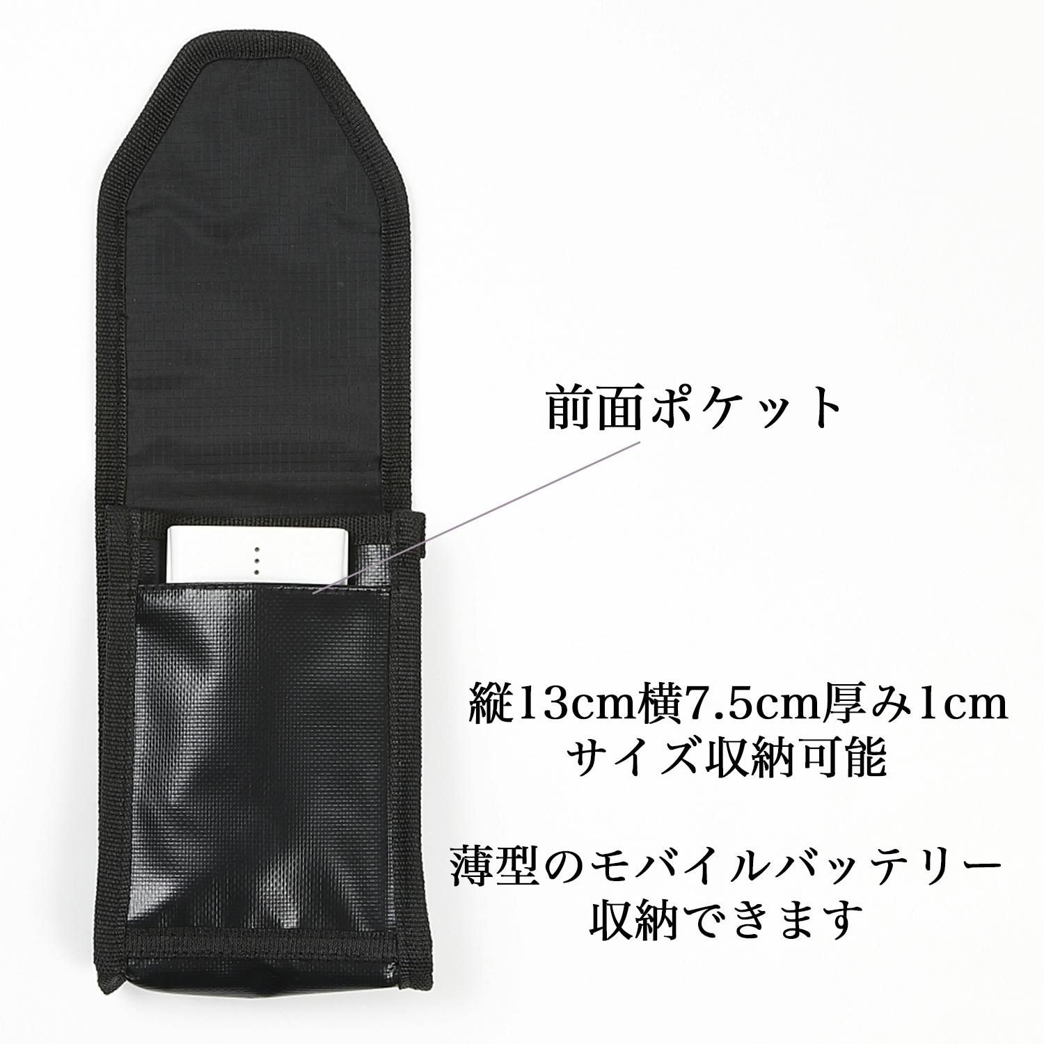 前面ポケットには薄型のアイテムを収納可能。スリムタイプのモバイルバッテリーも入ります。