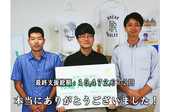 2018/07/31 17:12昨日で、クラウドファンディングの期間が終了しました。皆様のおかげで、目標金額を400万円弱も上回る15,472,672円のご支援をいただきました。改めて心から感謝申し上げます。本当にありがとうございました。お預かりしました寄付金は、キャンペーンページでもお伝えしているとおり、下記の使途で活用させていただきます。 ▼資金使途(1)新物件の初期費用(敷金・礼金等)(2)塾の内装工事にかかる費用(3)空調・キッチン等の初期設備費用(4)移転等費用※詳細はこちら(https://camp-fire.jp/projects/view/84621#menu)のページをご覧ください。※実際の費用が予算よりも抑えられた場合は、その余剰分を高槻市で被災した子どもたちの塾の受講料に充当させていただきます。 また、目標金額を超過していただきました390万円ほどのご寄付につきましても、被災した子どもたちの塾の受講料に充当させていただきます。超過分のご寄付だけで、およそ325人・月の子どもたちに無料で授業を提供することができます。なお、いただきました寄付の使途については、本年12月末までに中間報告をさせていただきます。 ▼今後のスケジュールについて8月上旬に物件を決定し、そこから内装の工事に入ります。内装工事の期間にもよりますが、9月中のオープンを目指しています。なお、塾のオープン前に、寄付者の皆様、支援者の皆様、地域の学校関係者、地域の方々などをお招きして内覧会を開催する予定です。また、開校を記念してのシンポジウムの開催も計画しています。今後の進捗につきましては、適宜、この活動報告及び当法人ブログ(https://ameblo.jp/attoschool/)でお知らせいたします。 ▼リターンについて皆様からのご寄付に対するリターンは、下記の通りとさせていただきます。なお、下記のページに記載しているリターンよりも一部、拡充をさせていただいています。 〇3,000円・5,000円・子どもからのお礼を電子メールで送信させていただきます。・子どもからのお礼メッセージ等を載せた新教室開校記念冊子(電子版)を電子メールで送付させていただきます。・寄付者のお名前を当法人ホームページ、新教室開校記念冊子、渡塾高槻校に掲示する銘板等に記載させていただきます。(希望者のみ) 〇10,000円3,000円のリターンに加えて、・希望される方には当法人理事長・渡剛が講演に伺います。(一部条件がありますので、下記をご覧ください。) 〇30,000円・50,000円10,000円のリターンに加えて、・子どもからのお礼メッセージ等を載せた新教室開校記念冊子(印刷版)を郵送させていただきます。 〇100,000円・300,0000円・500,000円30,000円のリターンに加えて、・感謝状を当法人理事長・渡剛が持参いたします。(希望者のみ・近畿圏のみ)※近畿圏外については郵送で対応させていただきます。 〇1,000,000円100,000円のリターンに加えて、・特別の銘板を作成し、渡塾高槻校に掲示させていただきます。(希望者のみ) 【備考】※ご芳名の掲載の可否等につきましては別途、寄付者の皆様に確認のご連絡を差し上げます。※新教室開校記念冊子につきましては、本年12月中に送付をさせていただきます。※当法人理事長・渡剛の講演につきましては、下記の場合に限らせていただきます。・講演の日時については当法人事務局とご調整ください。スケジュールによっては、ご希望の日程にうかがえない場合がありますが、ご了承ください。・講演は、参加者が10名以上の場合のみお引き受けさせていただきます。参加者の上限はありません。・講演の場所は日本国内であれば、どこにでもうかがいますが、交通費は別途ご負担ください。・講演時間は60分から90分を想定しています。・渡が講演可能なテーマとしては下記のものが想定されます。 「子どもの貧困」「ひとり親支援」「学習支援」「学力向上」「ボランティア」「社会起業」「ソーシャルビジネス」 など 引き続き、寄付者の皆様には定期的に進捗状況をご報告させていただきます。今後ともよろしくお願いいたします。 もっと見る