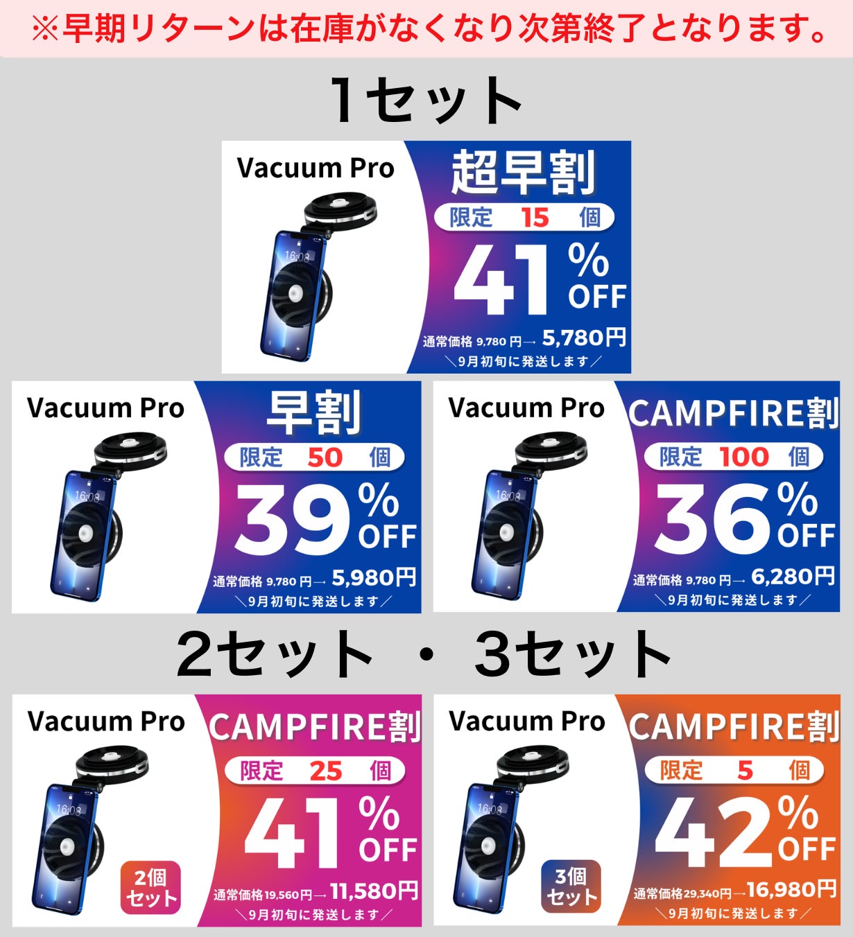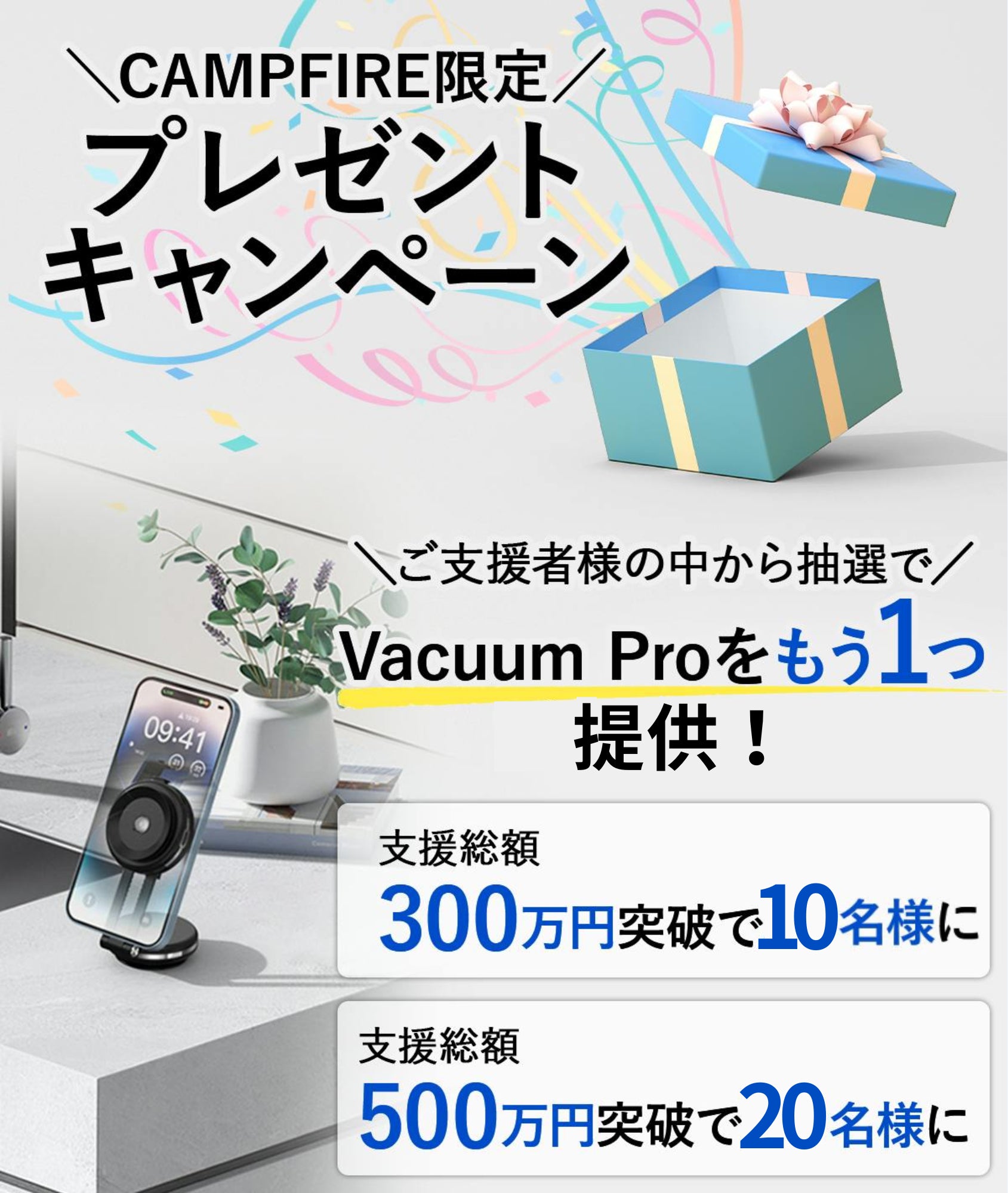 大好評をいただき大成功したプロジェクトを記念して、CAMPFIREだけの購入者限定特別キャンペーンを実施します!ご支援者様の中から抽選で当たった方に、なんとVacuum Proをもう1つ提供!!
