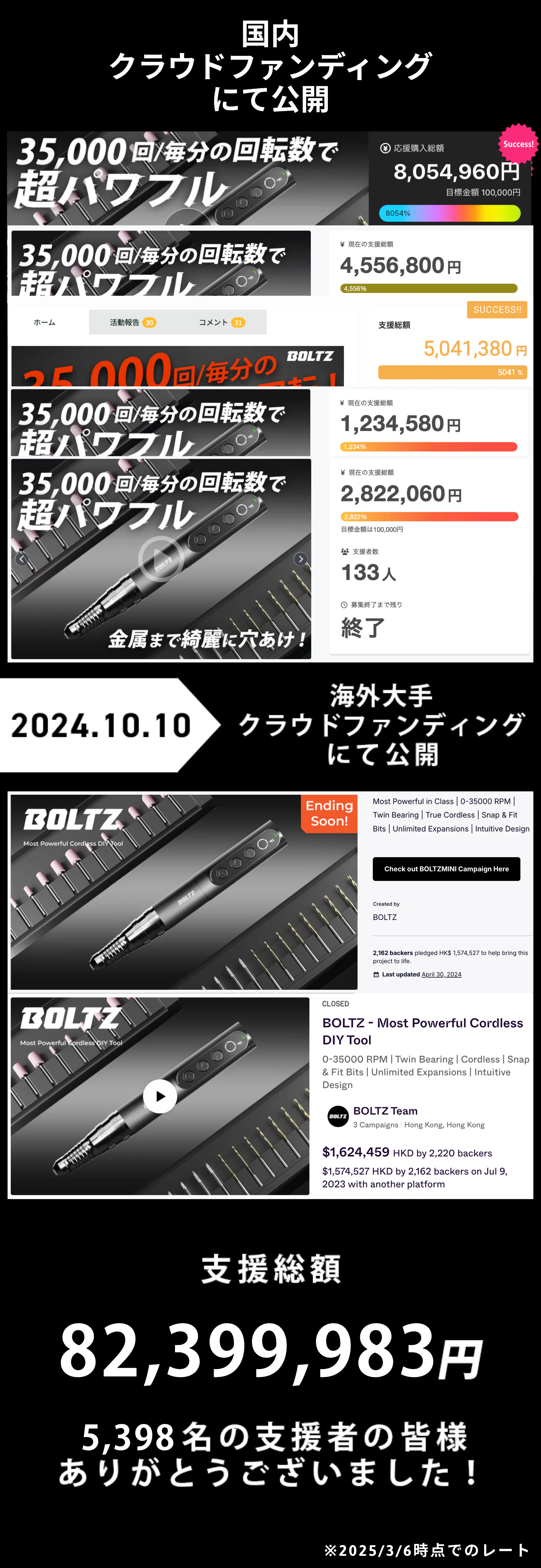 市場で人気のあるデザインを入手し、研究した結果、スマートでモダンなデザインとパワフルな35000RPMモーターを組み合わせたプロトタイプを完成させました。また、工具を瞬時に切り替えられる二重直径クランプなど、特別な工夫も加えました。発売前に、多くの潜在的なユーザーにBOLTZを送り、試してもらいました。彼らのフィードバックにより、BOLTZはさらに改良され、最高のコードレスDIYツールとなりました!